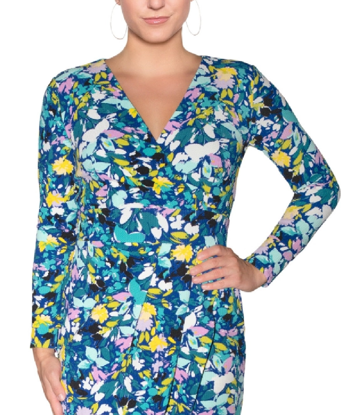 A burst of blossoms beautifully highlights this faux-wrap midi dress from Rachel Roy