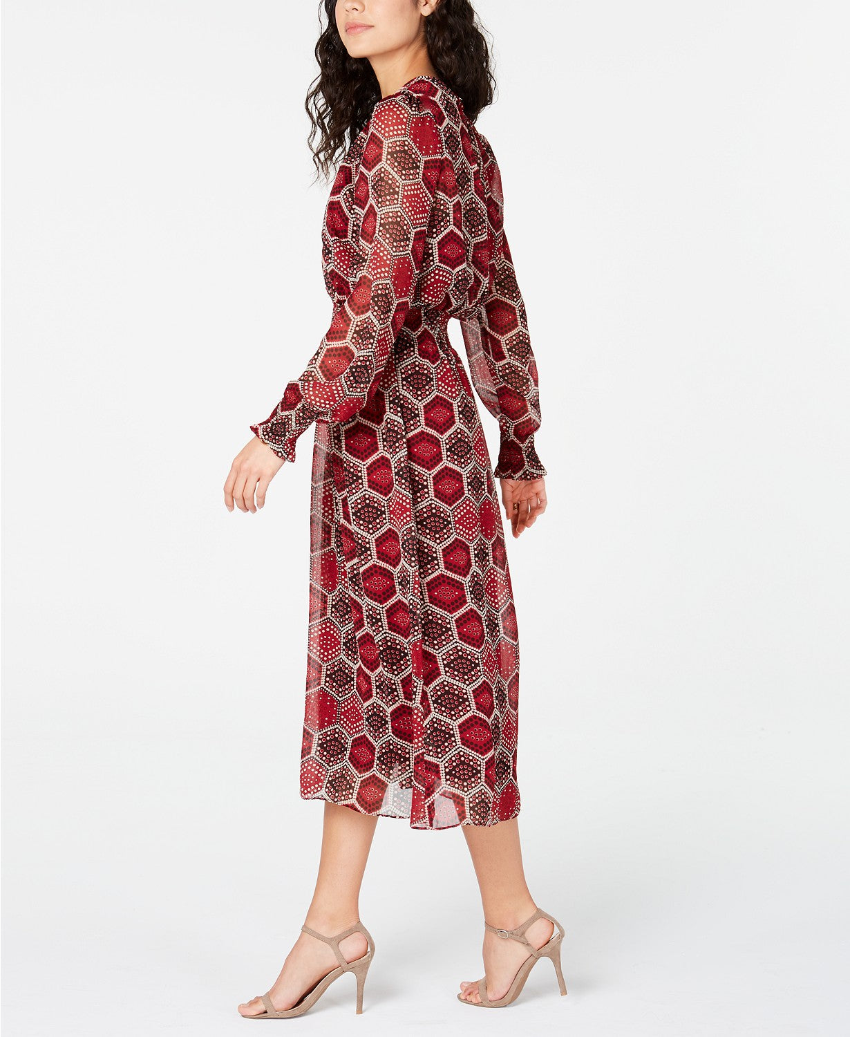 Button closure at back of neck | Approx. model height is 5'10" and she is wearing a size small | Crewneck; midi silhouette | Imported | Semi-sheer at yoke and sleeves; fitted waist; ruffle detail at wrists | Machine washable | Polyester