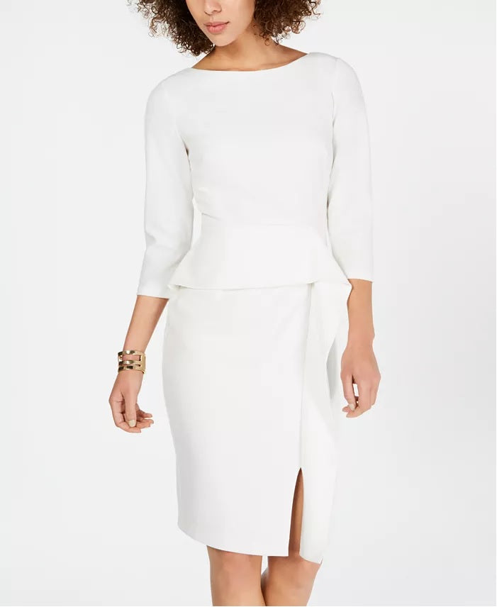 Approx. 42" long from center back to hem. Length is based on size 6 and varies 5/16" between sizes|Boat neckline; Sheath silhouette|Hidden center back zipper and hook-and-eye closures|3/4-sleeves|Peplum at waist; ruffled at front|Polyester/rayon/spandex; lining: polyester