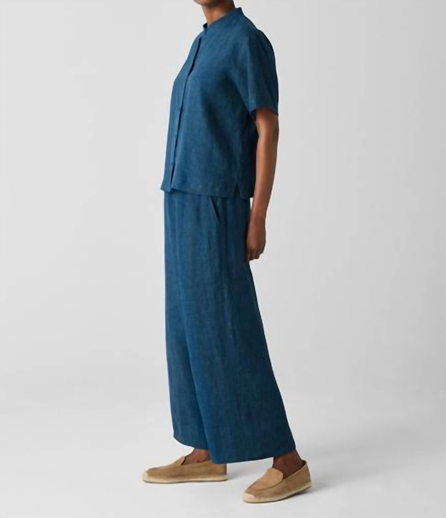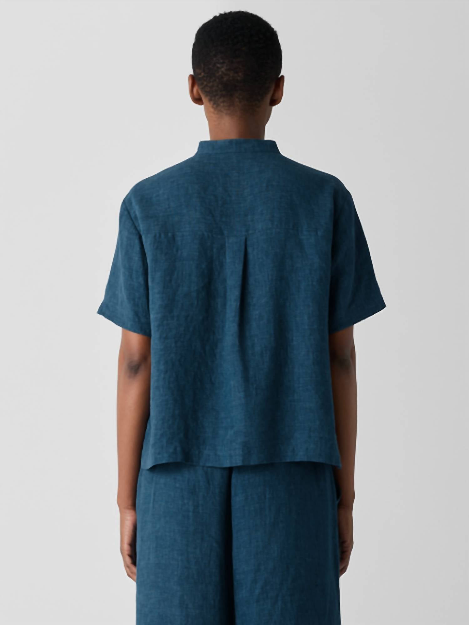 A classic button down shirt that will never go out of style. Relaxed and refined. The band collar shirt updated for warmer weather by short sleeves and breezy organic linen. Délavé dyed for nuanced color—pair it with our matching pant to make it a set. Made in a Fair Trade Certified™ factory. Style No. S5LOL-T6166 Close at the shoulders, wider at the hem. A silhouette that fits the body withease. Bo Bay is 5'9" and wears a size XS, which measures 22 1/2 inches on the body.Size 1X measures 25 1/2 inches on the body. Band collar, short sleeves, button front. Back yoke with center back box pleat. 2-inch side slits at the hem. River shell buttons.