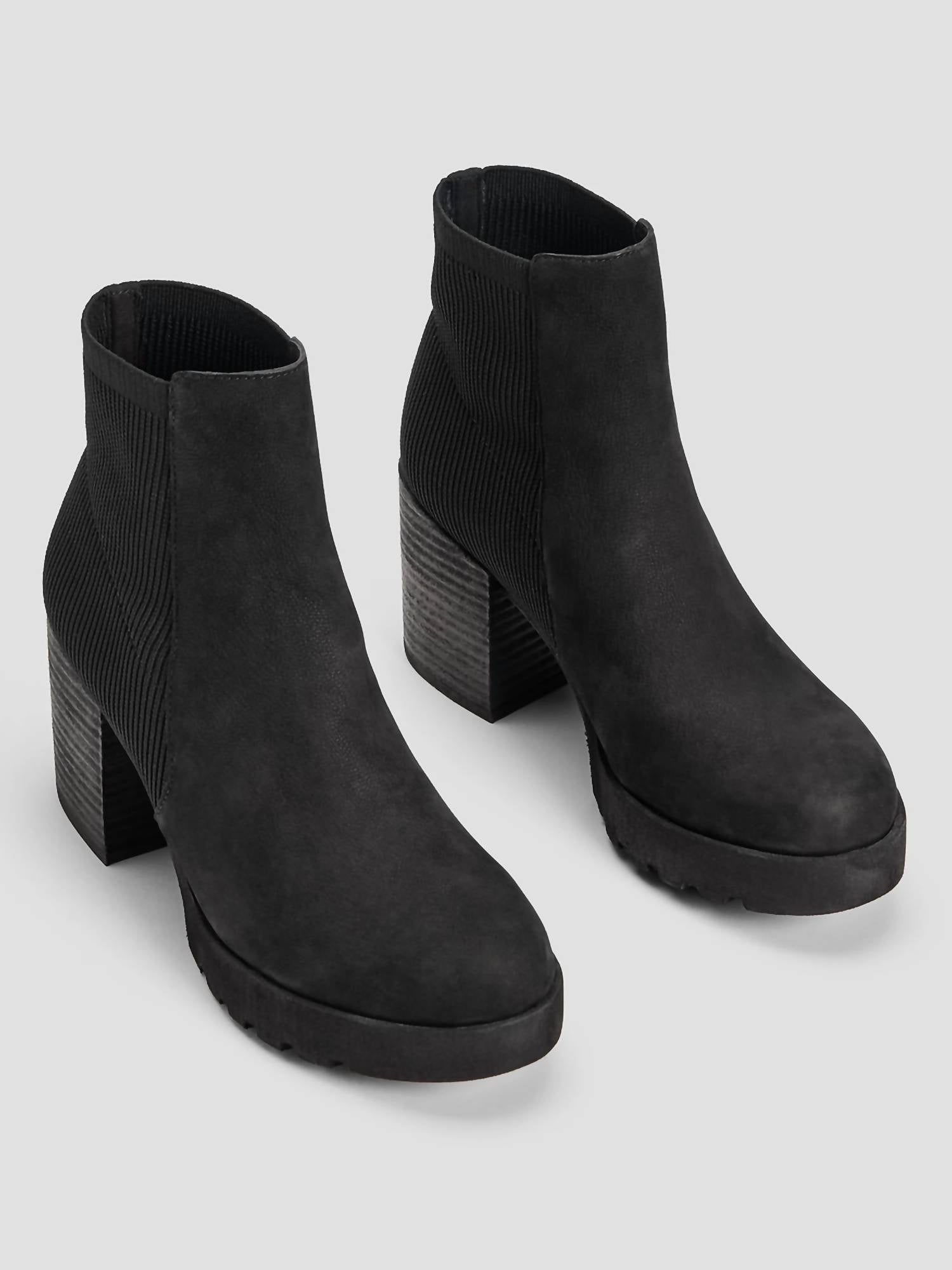 Say hello to the perfect, most versatile boot. The ankle height makes this style easily transition from day to night. Wear them with your favorite skinny jeans and tee for a more laid back look, or pair them with your favorite mini dress and jacket for a night out on the town. Elevate your fall footwear with the Women's Farrah Leather Tumbled Nubuck Bootie by Eileen Fisher. These black booties combine sleek tumbled nubuck leather at the front with a recycled stretch knit back, meeting the Global Recycled Standard. Designed for comfort, they feature a rubber outsole with tread bottom, a padded toe, arch, and heel, alongside a 2-inch block heel complemented by a 1-inch platform and an almond toe for a minimalist, travel-friendly silhouette.