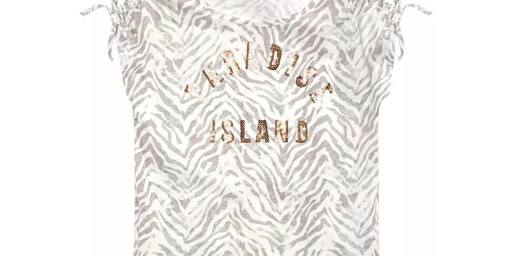 Scoop neckline|Sequined 'Paradise Island' graphic at front; ties at shoulders|Cotton/polyester|Machine washable|Imported