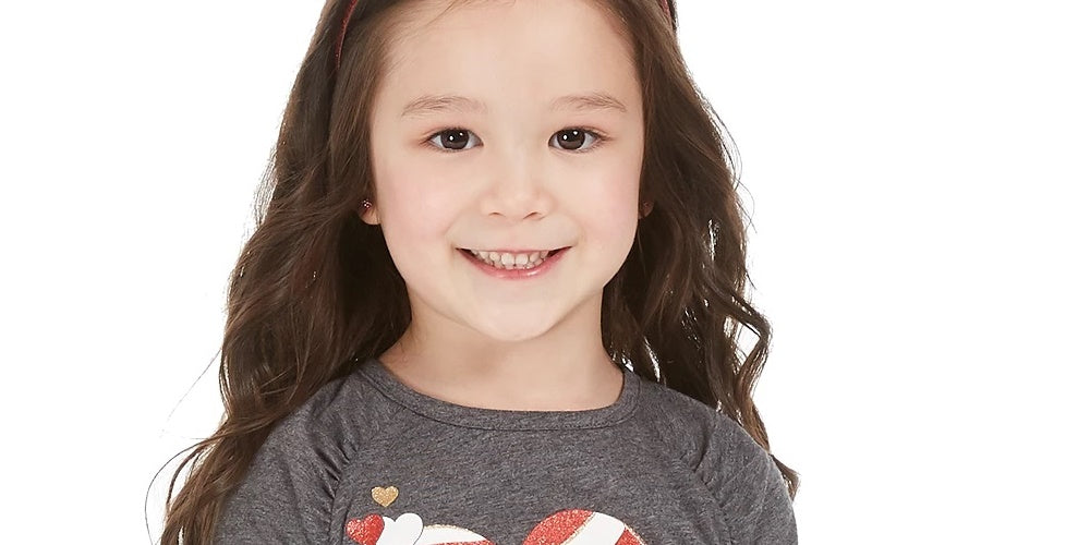 Scoop neckline|Graphic print with glitter detail at front|Puckered raglan sleeves|Cotton/spandex|Machine washable|Imported