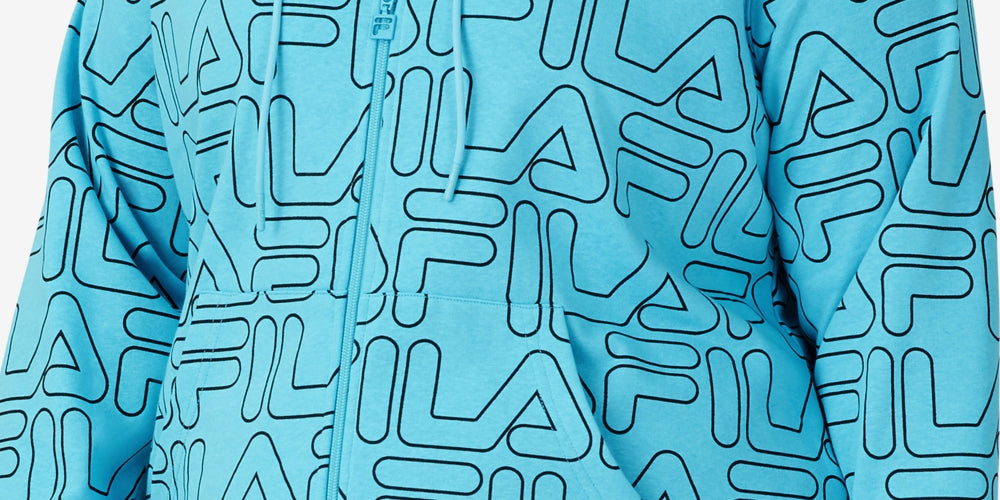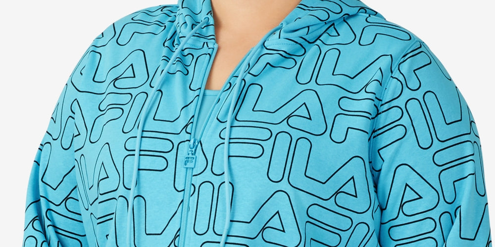 A fabulous Fila print covers this thick plus size hoodie| perfect for outdoor exercise on days with a bit of a chill or warming your muscles on the way to a class.| Relaxed fit| Attached hood with drawstrings; front zipper closure| Kangaroo pockets at front| Lined| Cotton/polyester