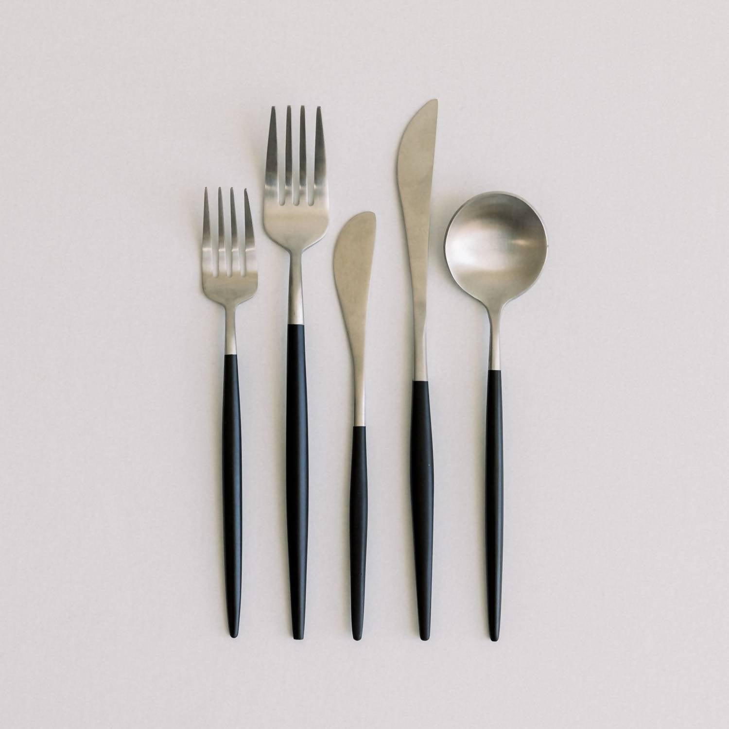 The Luna Flatware 5 Piece Set by borrowed BLU seamlessly combines a sleek modern design with durable 18/10 stainless steel construction, perfect for your classic formal setup. This set includes a salad/dessert fork, dinner fork, butter knife, dinner knife, and teaspoon in striking black and silver. Though dishwasher safe, hand washing with mild detergent is recommended to maintain its pristine condition, avoiding lemon detergents to prevent corrosion. Additional color options are available to suit various dining aesthetics.