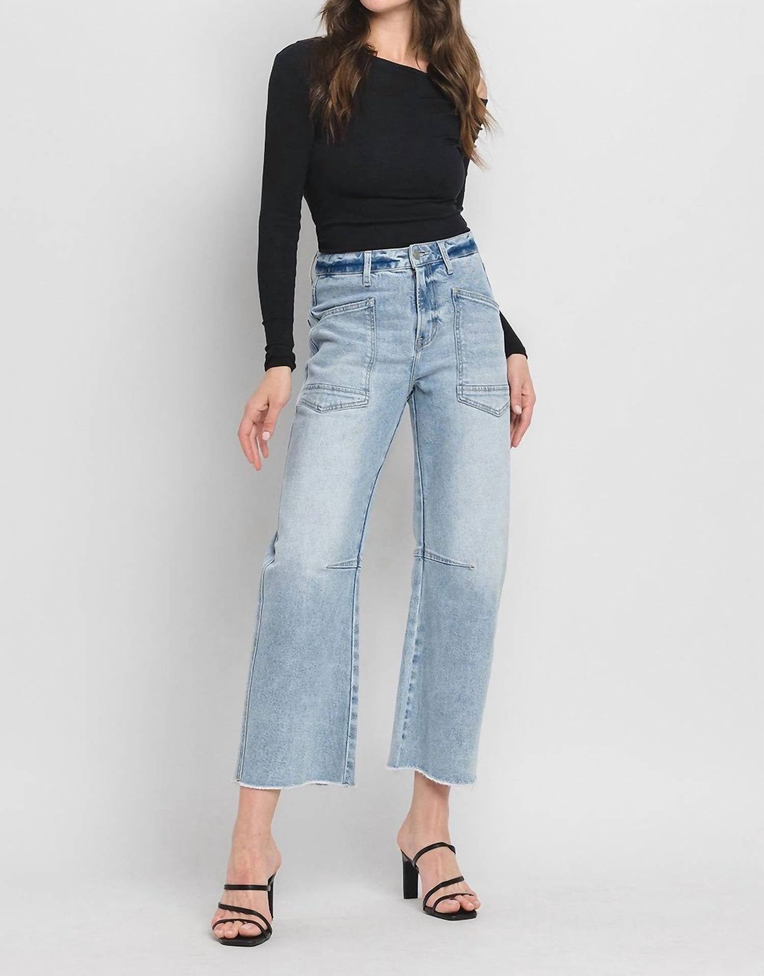 Comfortable and stylish, we love this cropped jean for all of the obvious reasons. Meet the High Rise Barrel Jean by FLYING MONKEY, designed for comfort and style in a relaxed fit. Featuring a high rise waist and raw hem, these medium wash wide-leg jeans offer a chic appearance perfect for dinner parties. Made from comfort stretch denim with a cropped length, the flattering 11-inch front rise and 26 3/4-inch inseam add to their allure. Closure: Button closure. Pockets included for functionality. Care: Machine wash and tumble dry. Ideal for your spring wardrobe.