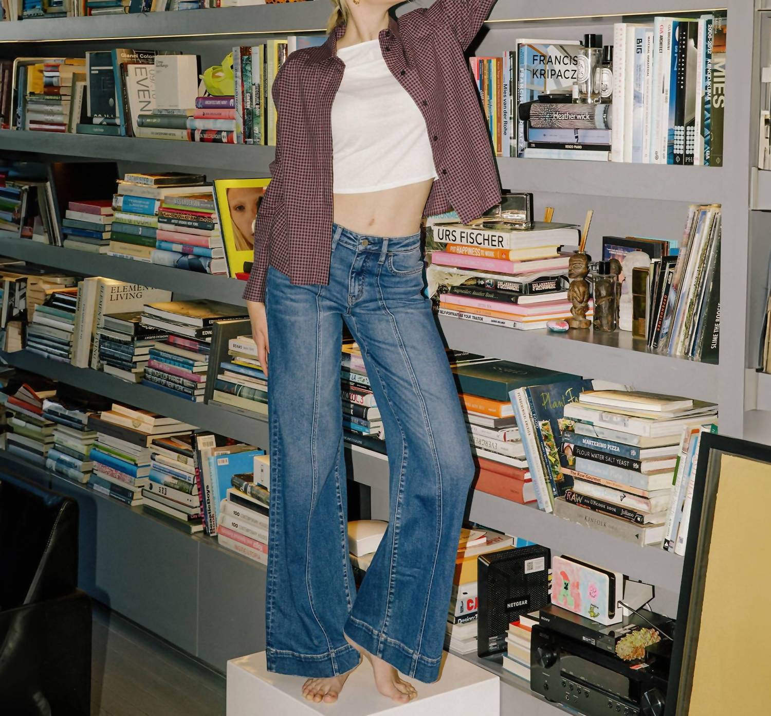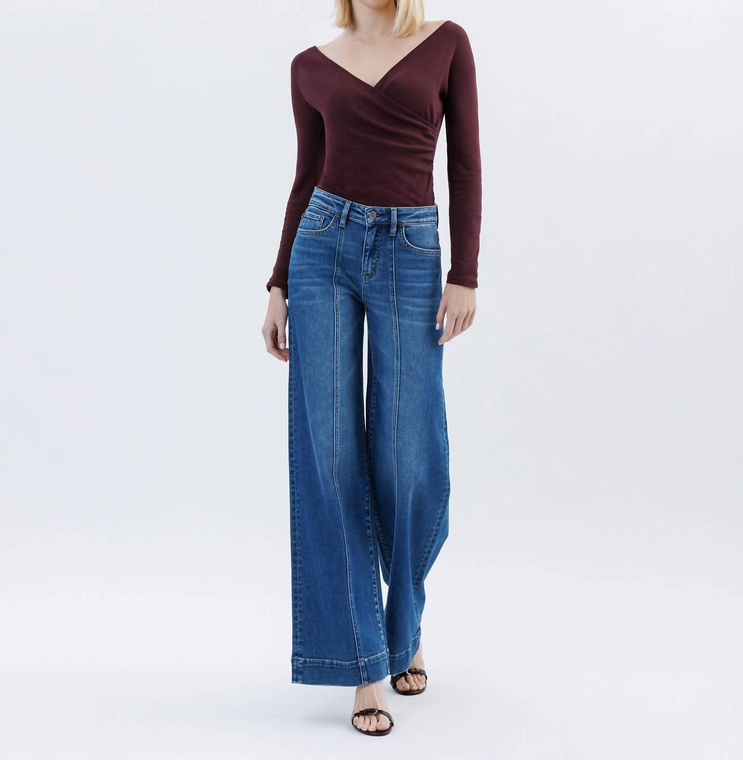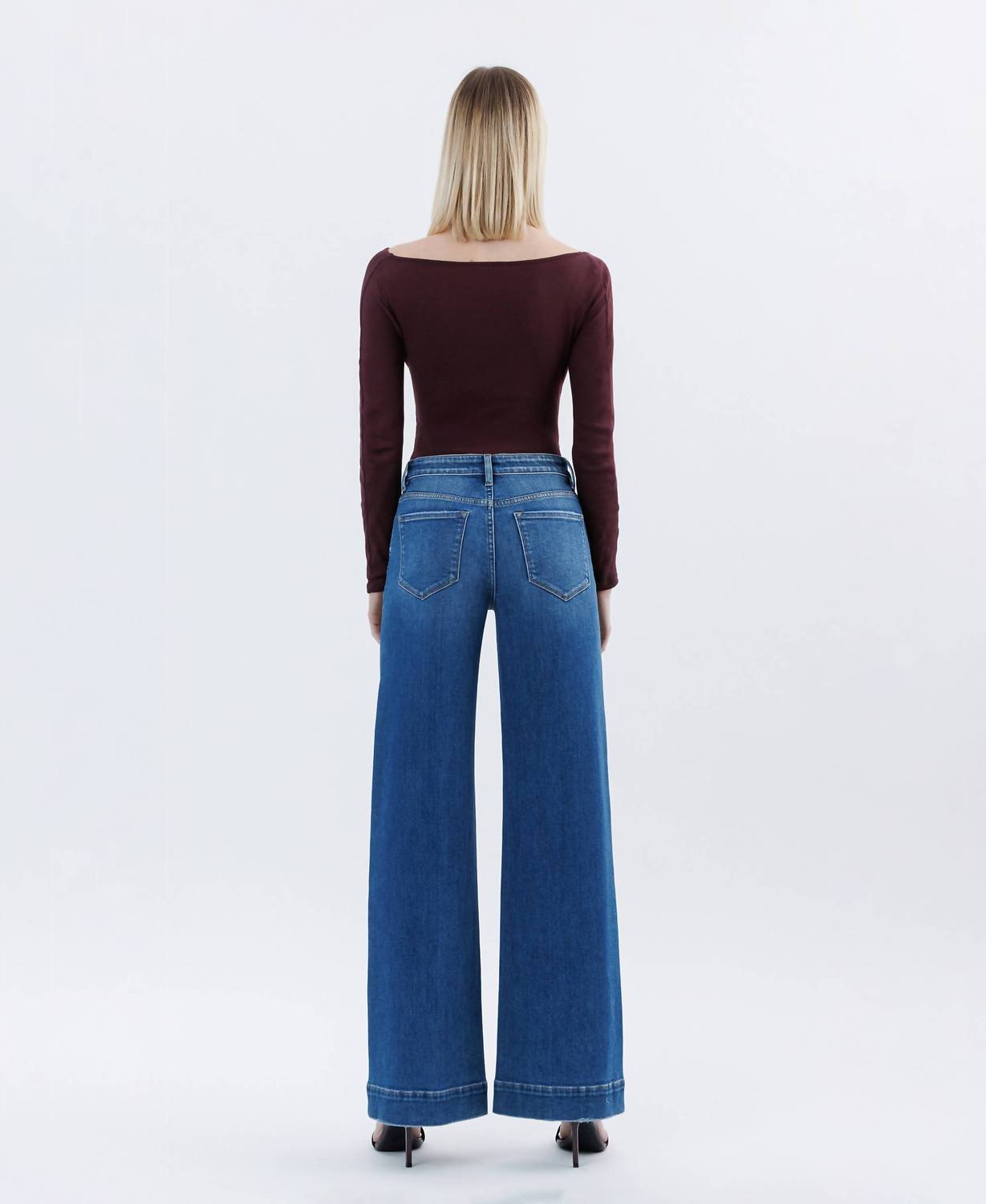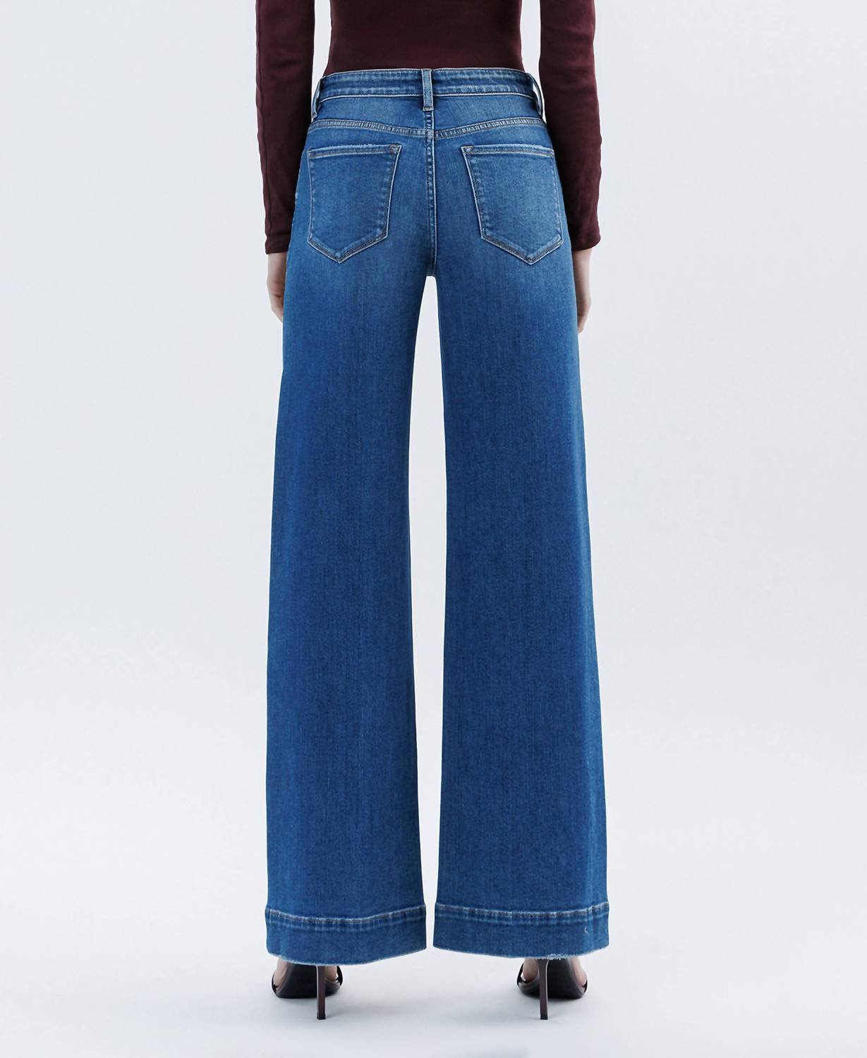 Pair these wide leg jeans with mules, slides or your favorite strappy sandals. Introducing the Flying Monkey High Rise Trouser Hem Extreme Wide Leg Jeans in the color Moon Bar, a must-have for your fall wardrobe. Crafted from comfort stretch denim, these pants feature a super high rise waist and a relaxed, wide-leg fit with a pleated design and a finished hem. With a zip closure and functional pockets, they offer both style and practicality. Care instructions include machine wash and tumble dry, making them an easy addition to your daily rotation. With a front rise of 11.5 inches, an inseam of 32 inches, and a 26-inch leg opening, they embody the 90s fashion trend, perfect for a housewarming or Thanksgiving occasion.