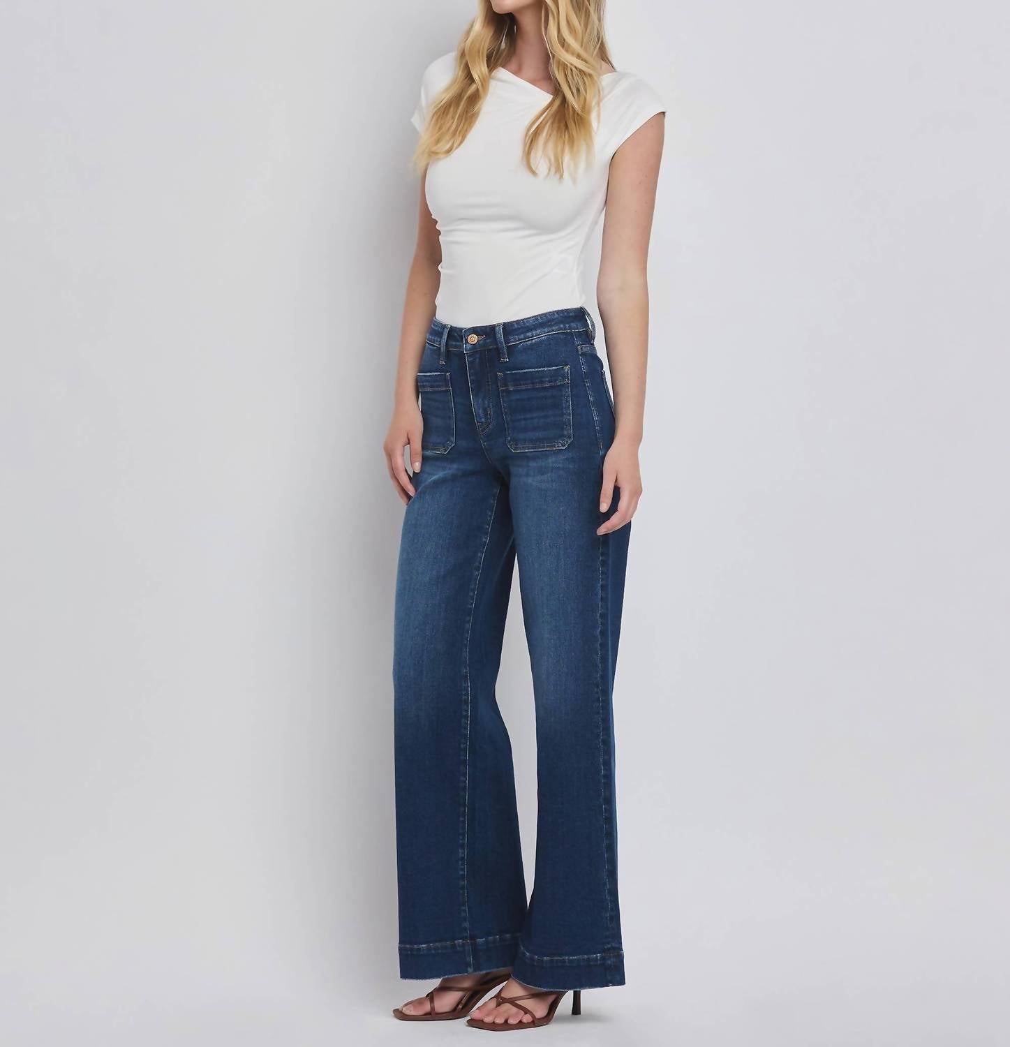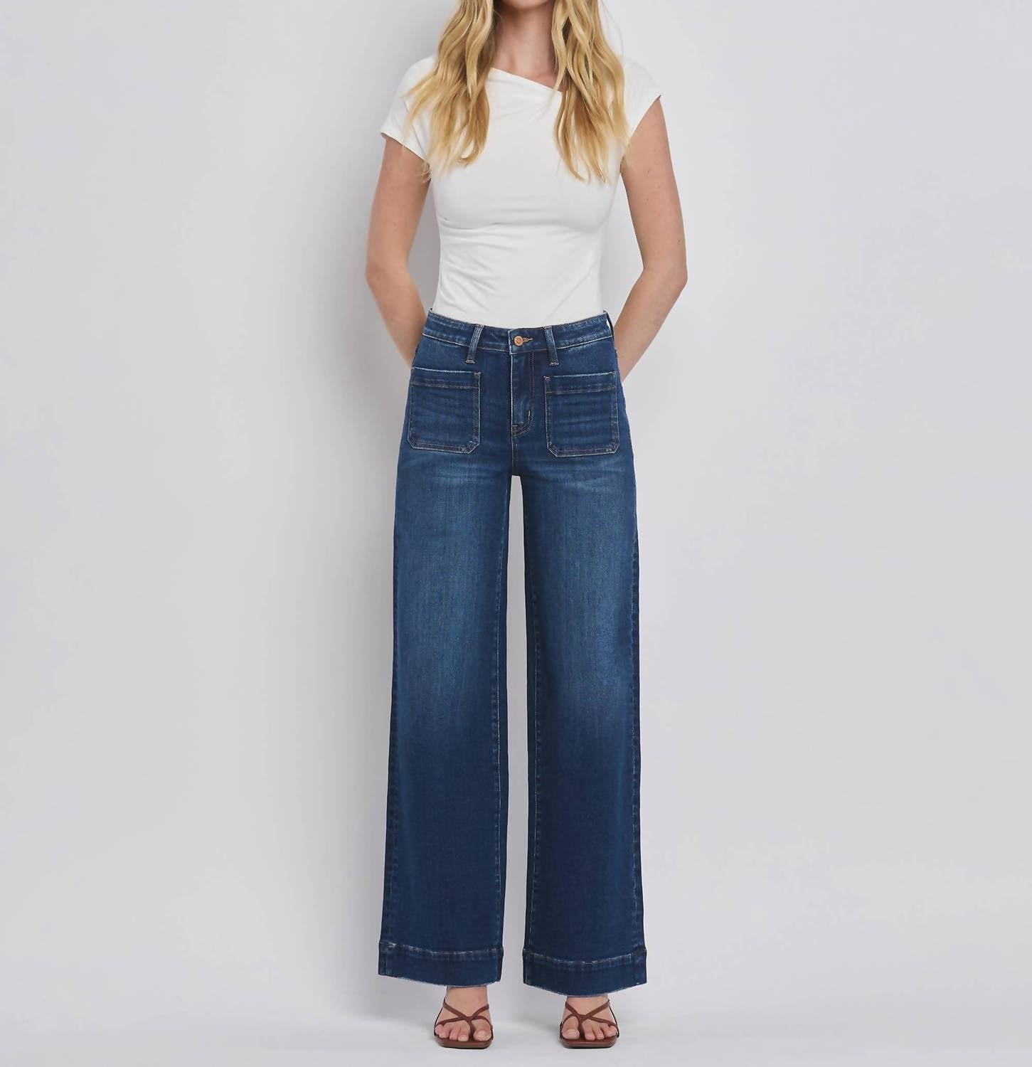 Just as cute as they are comfortable. Elevate your wardrobe with the High Rise Wide Trouser Jeans from Flying Monkey, perfect for embracing a 90s fashion trend in dark denim. These full-length jeans are crafted from comfort stretch denim and feature a high rise waist with a 10" rise, and a wide leg style with a generous 22" leg opening. They are designed with patched pocket details and a zip closure for a classic look. Care for these stylish trousers is easy with machine wash and tumble dry instructions. Model is 5'10" and wearing a size 26, with an inseam of 32".