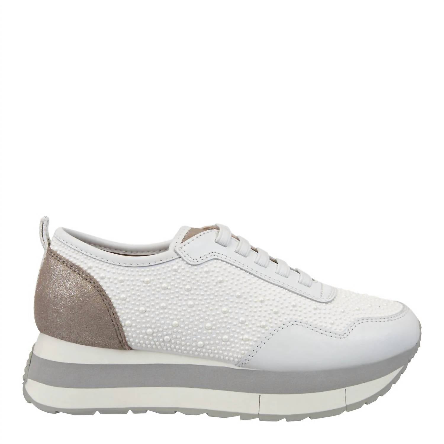 When fashion and function come together seamlessly.Step up your athleisure game in shimmering White Pearl. Effortless yet refined style. Featuring slip-on elastic laces for easy access. Durable high-traction sole. Lightweight EVA foam platform. Offer comfort and functionality. Handcrafted with premium leather and woven textile. Lined with soft fabric for an ultra-plush feel. Artisanal details lend an elevated bohemian chicness. Versatile, stylish, and utterly comfortable platform sneakers.