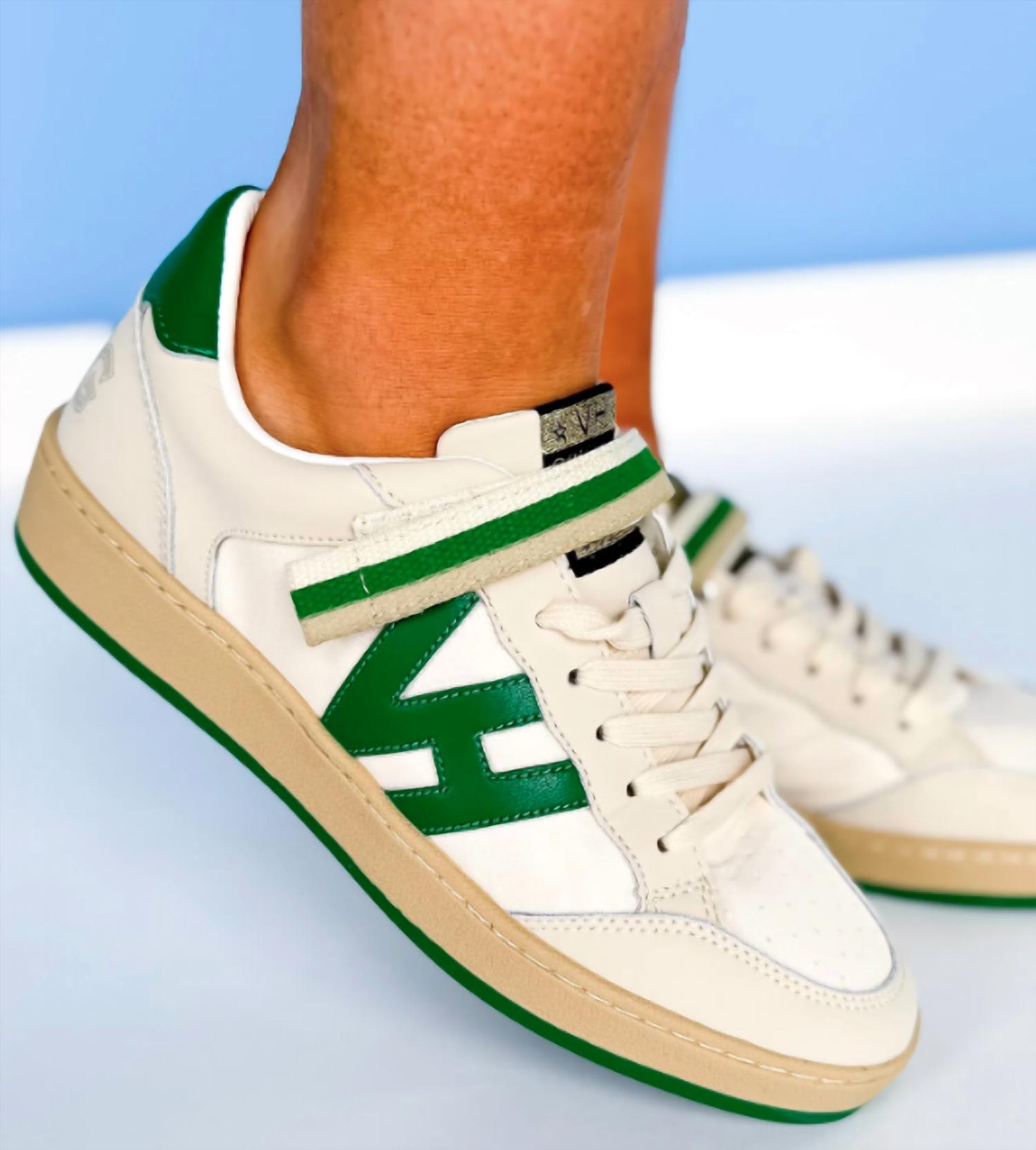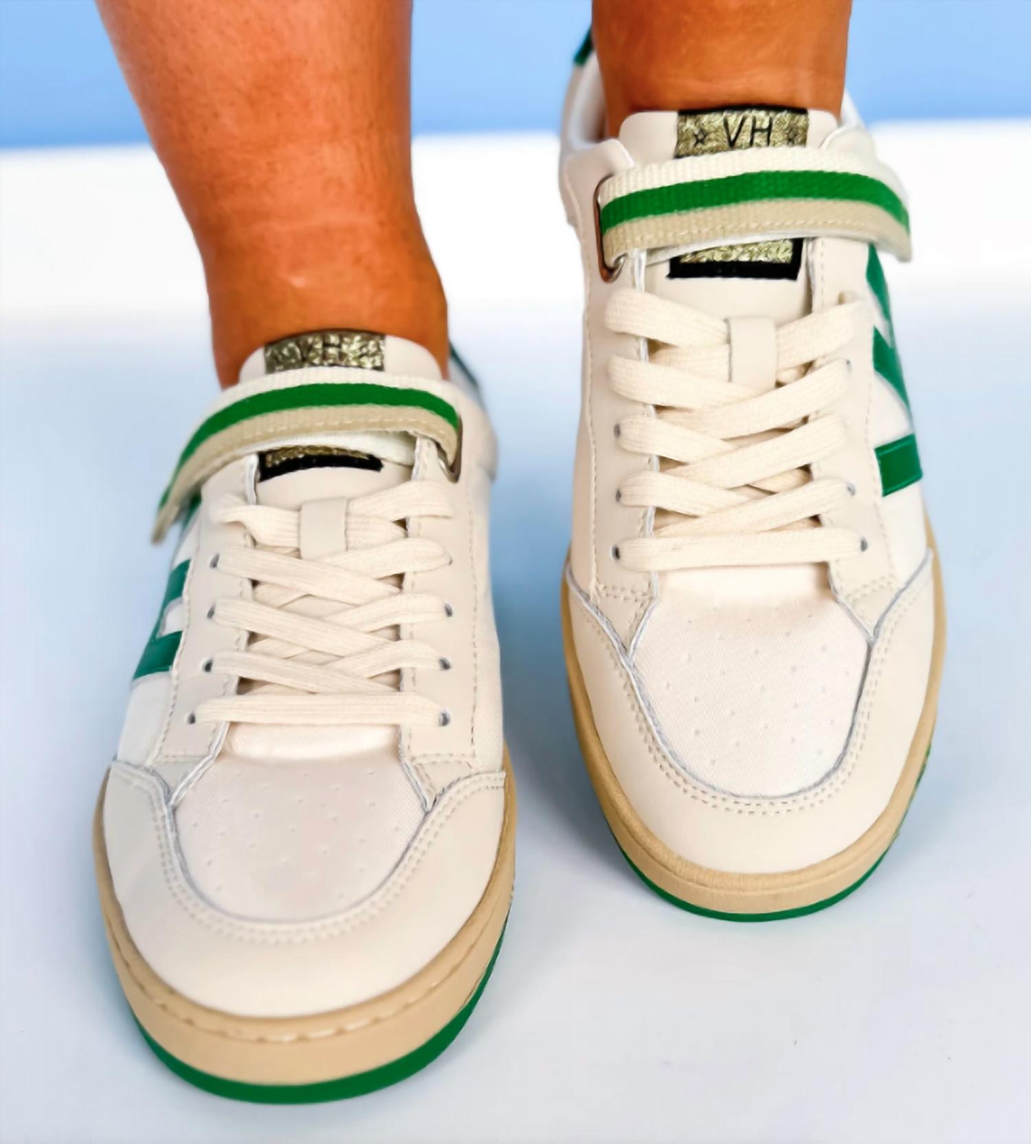 Cute, functional, and comfortable. These sneakers check all the boxes. Step up your summer style with the Women's Next 6 Sneakers by Vintage Havana, featuring an iconic green VH logo. Designed with a round toe and strap closure, these sneakers boast a low-top silhouette in a chic cream and green palette. The flat heel ensures comfort, while the off-white strap adds a trendy touch. Perfect for adult women seeking casual elegance, these sneakers will keep you stylishly grounded all summer long.