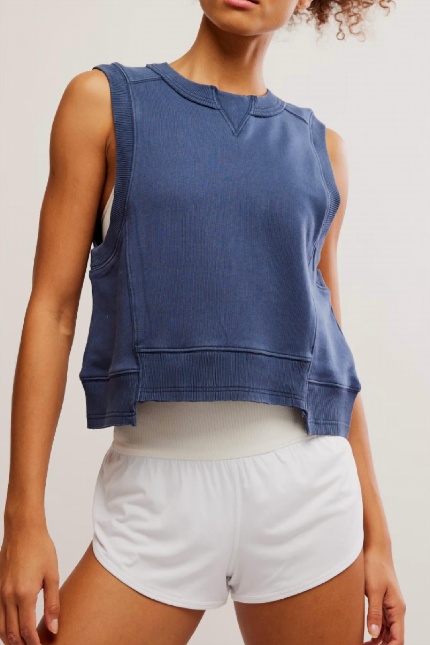 Discover the FP Movement Intercept Sleeveless Tank Top in timeless navy, the perfect activewear piece for your summer workouts. This tank combines a comfortable sleeveless design and a crewneck, crafted from a cozy cotton blend composed of 80% cotton and 20% polyester. With its relaxed fit and boxy silhouette, it hits right at the hip, offering versatile wearability. Care is a breeze with machine wash cold and tumble dry instructions, while its pull-on style ensures ease of wear. Length: 21 inches, Bust: 40.5 inches for size small.