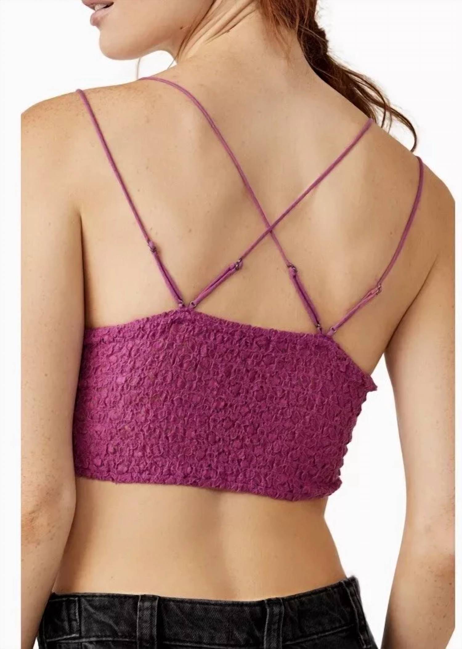 Airy crochet plays up the romance of a longline bralette backed with crisscrossing straps and a comfortable panel of shirred lace. 5 1/2" center front length (size medium). Deep V-neck. Adjustable straps. Partially lined. 60% cotton, 40% nylon. Hand wash, dry flat. Imported.