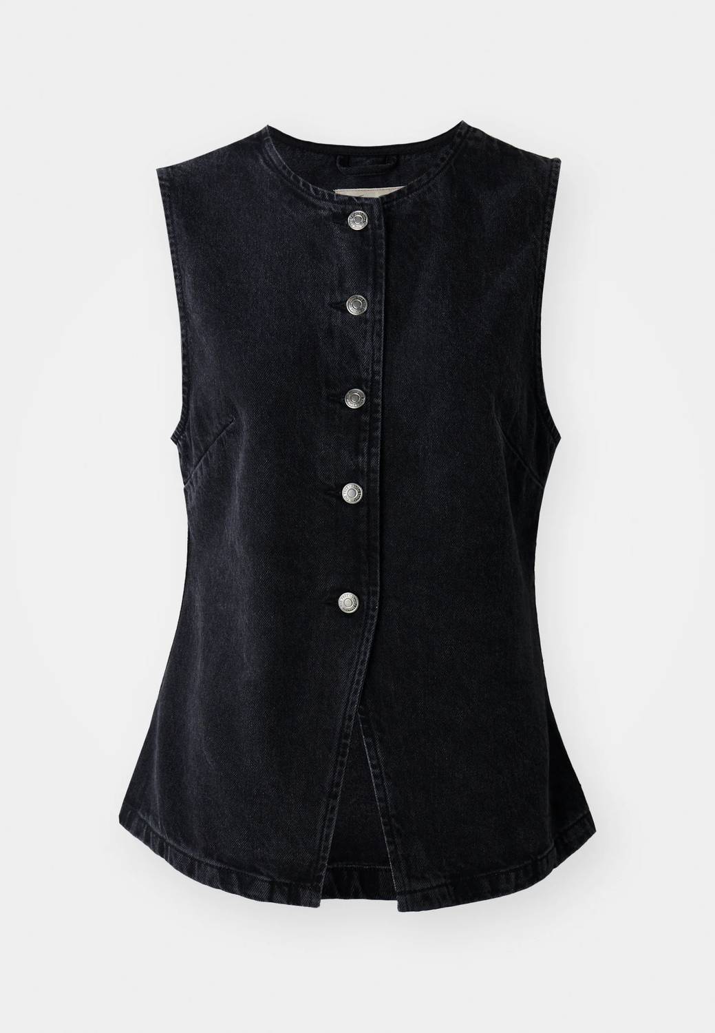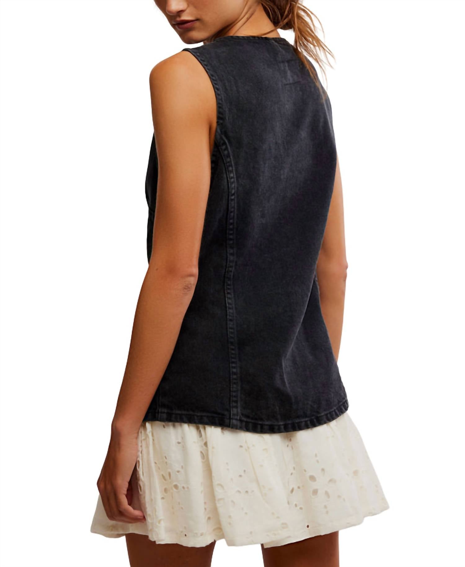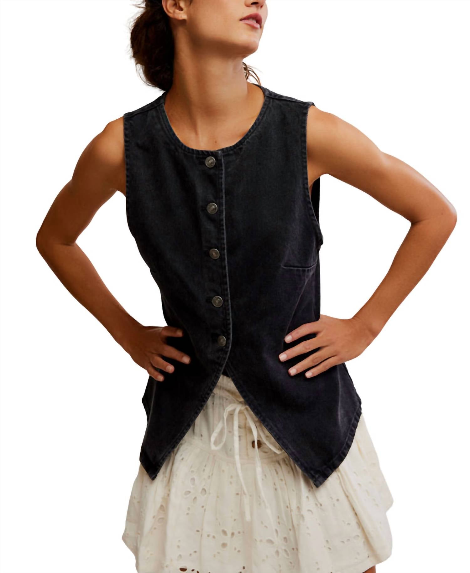 A vest so versatile you can mix and match it with almost any outfit and it will feel brand new every time. Introducing the Aimee Vest by Free People, an ultra-flattering piece in chic black for the modern woman. This sleeveless vest features a crew neckline and is crafted from 100% cotton washed denim with intentional darting for a semi-fitted silhouette. The button-front closure leads to a flared pointed hem, adding a stylish touch to the full-length design. Care instructions recommend machine washing cold for effortless maintenance.