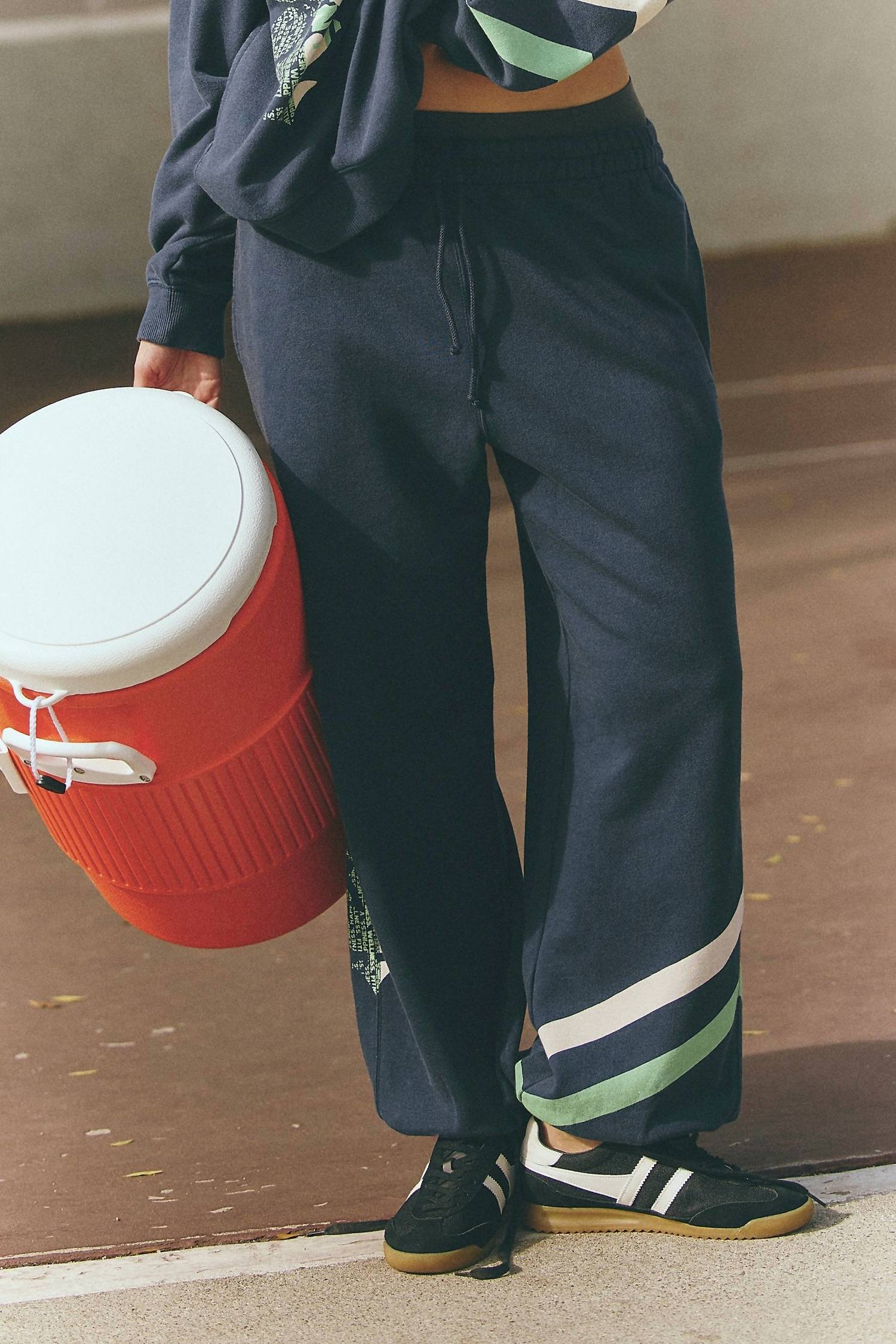 Elevate your casual wardrobe with the All Star Logo Pants by Free People, designed for both comfort and style in Midnight Navy Sport Mode. These women's sweatpants offer a soft fabrication, mid-rise relaxed fit, and tapered leg style with cinched bottom hems. Featuring an oversized graphic, smocked elastic waistband with an adjustable drawstring, and convenient pockets, these pants are perfect for your active lifestyle. Ideal for fitness or workout sessions, embrace the athleisure trend with these essential throw-on-and-go bottoms. Closure: Tie closure.