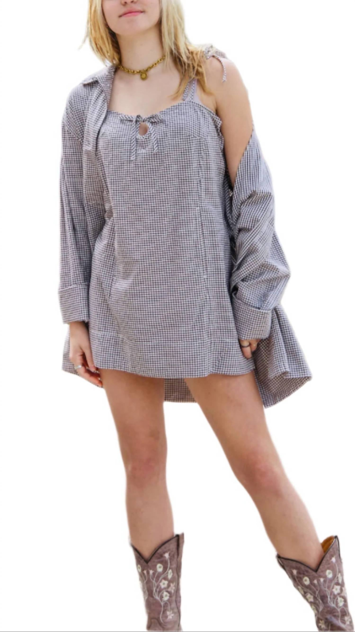 The Arlo Set by Free People combines casual elegance with versatile style. This loungewear set features a sleeveless dress and matching oversized shirt, both crafted from 100% cotton for a soft finish. The dress has a sweetheart neckline with adjustable tie-up shoulder straps, front pockets, and a low open-back with zipper closure, while the shirt is characterized by its printed gingham design and drop-shoulder sleeves. Perfect for effortless outfitting, this set can be machine washed for easy care.