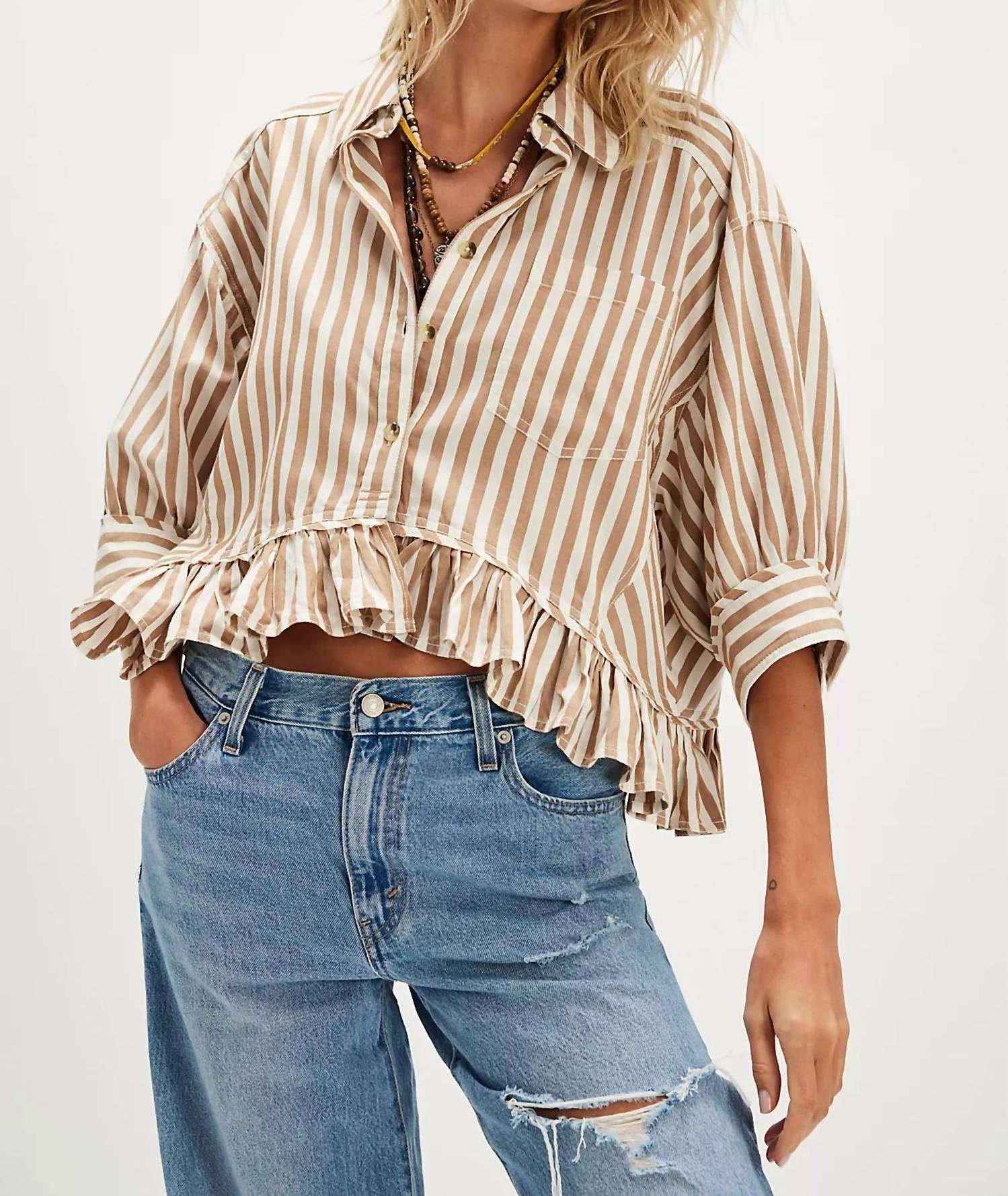 Perfectly tailored and soft to the touch. Introducing the Bailey Stripe Shirt by Free People, a refreshing feminine twist on the classic button-down. Crafted from 100% cotton, this hip-length, relaxed-fit shirt boasts a striking striped design, collared neckline, and three-quarter drop-shoulder sleeves with cuffs. Featuring button-front closures and a charming ruffled hem, it's a stylish yet playful nod to menswear. Care: Machine wash. Measurements for size Small: 51.5 in bust, 22.75 in length.