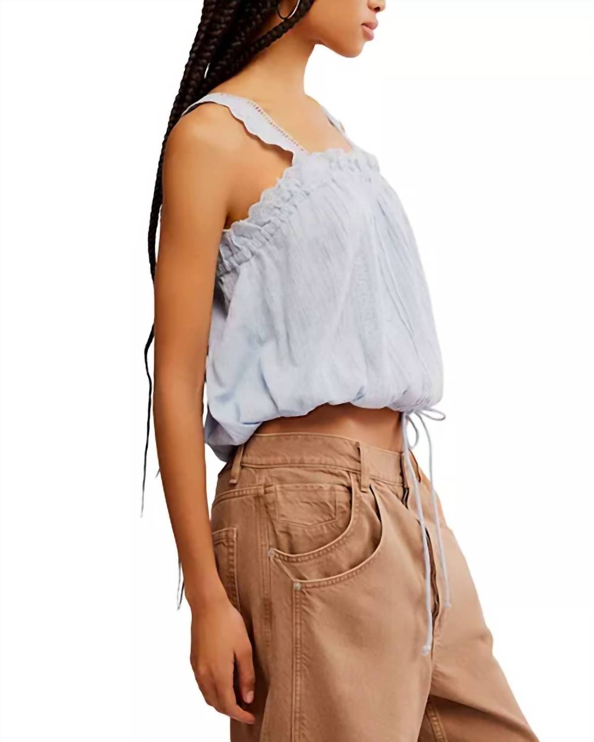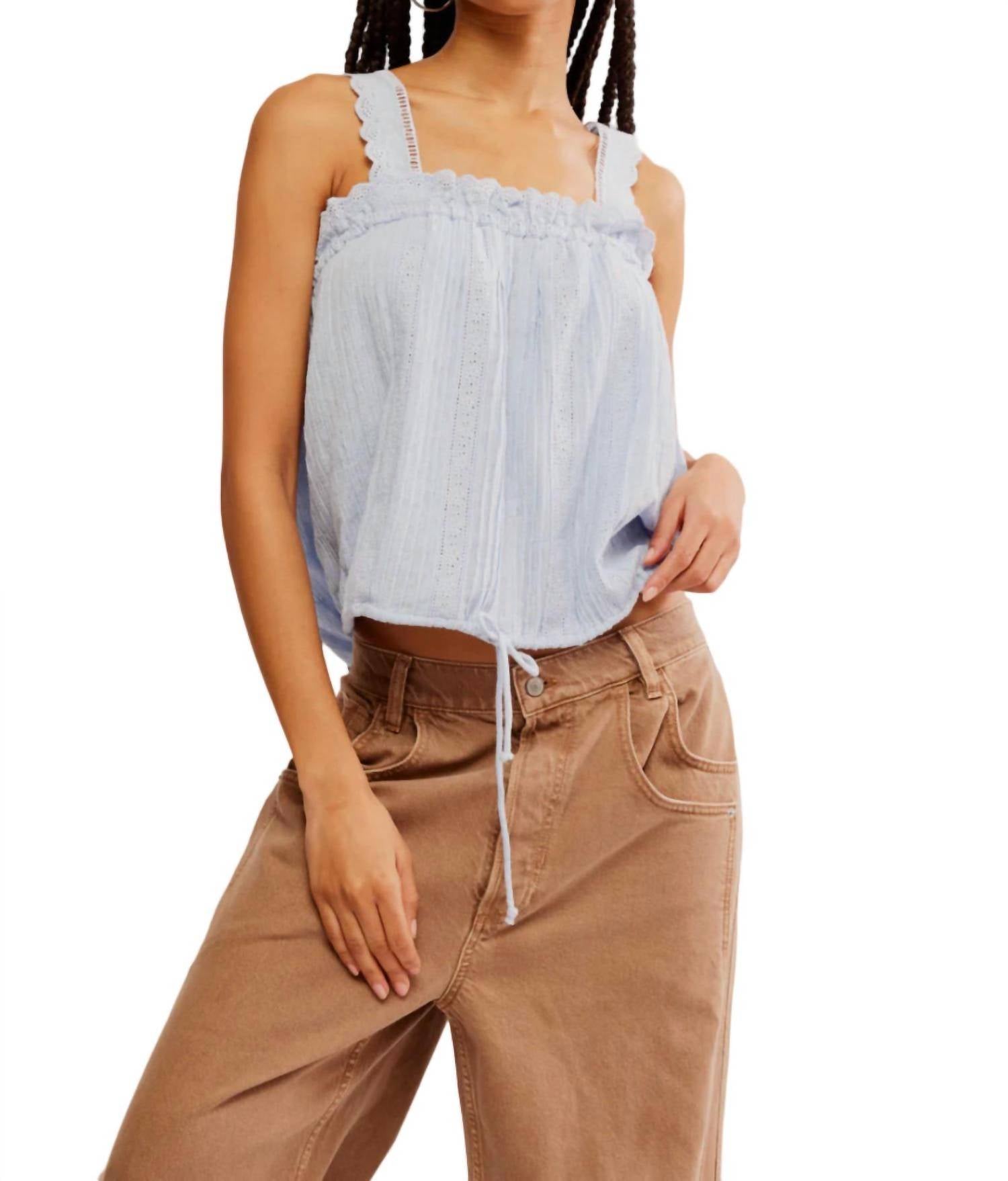 Introducing the Because Of You Tank by Free People, where timeless style meets charming detail. This sleeveless top, in a soothing chambray hue, boasts a delicate lace trim and a flattering tie at the waist. Crafted from a cotton blend with a solid pattern, it features a sophisticated squareneck and pull-on closure. Care for this piece with a gentle hand wash in cold water to maintain its fresh, lightweight feel.