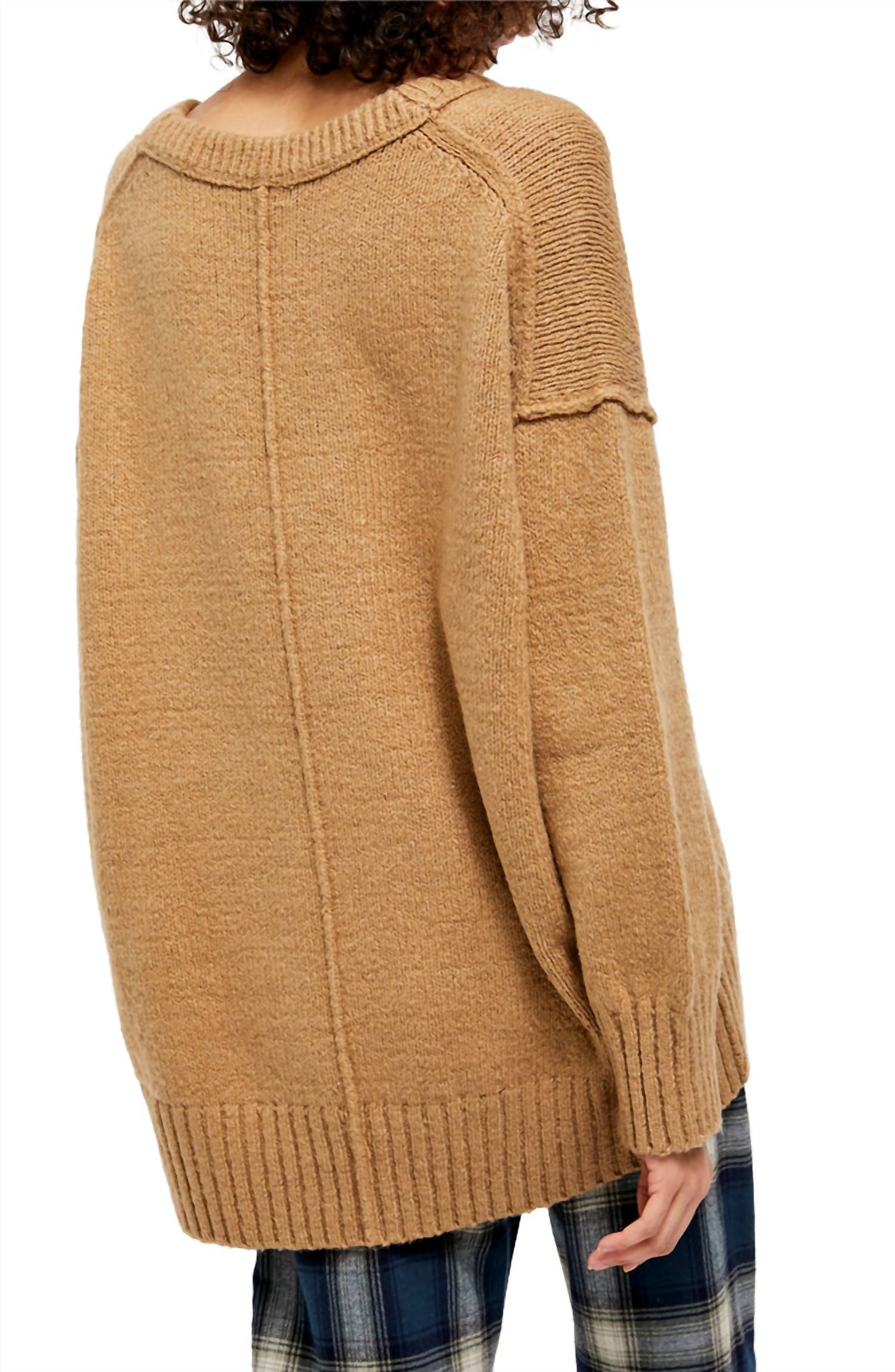 Discover the versatile charm of this tunic blouse, designed with both layering and standalone wear in mind. Its flattering silhouette and stylish details make it a closet essential. Embrace relaxed elegance with the Brookside Oversized Tunic Sweater from Free People, featuring long, dropped dolman sleeves and a scoop neckline. Crafted in solid Desert Camel cotton, this tunic is a perfect fall essential with exposed seaming and ribbed hemlines for added style. Closure: Pull on. Care: Machine wash and tumble dry.