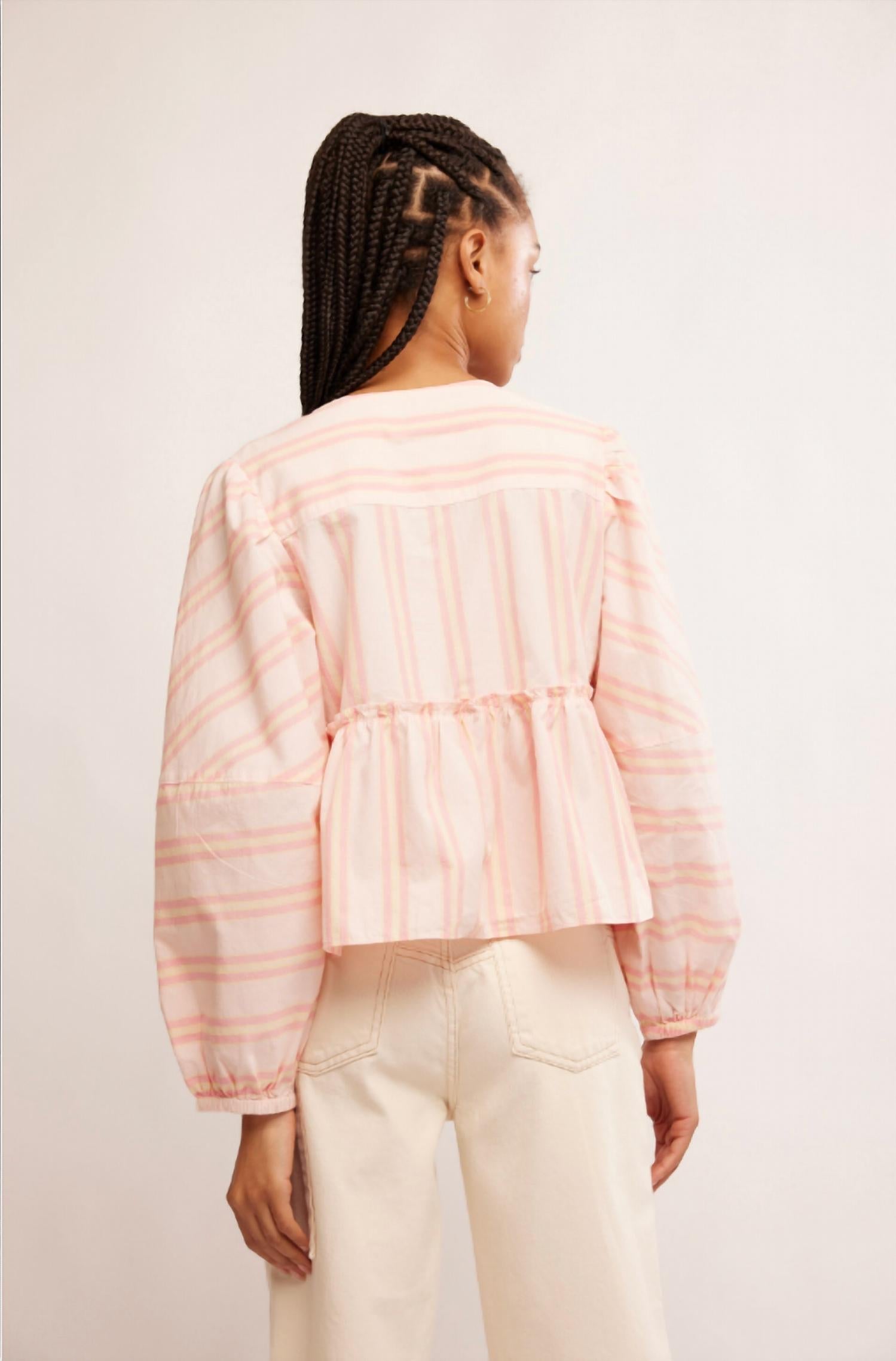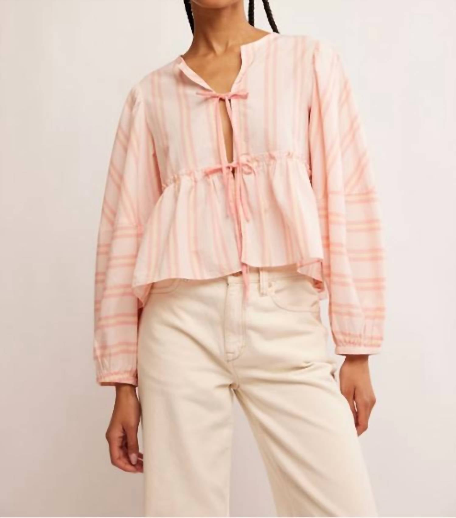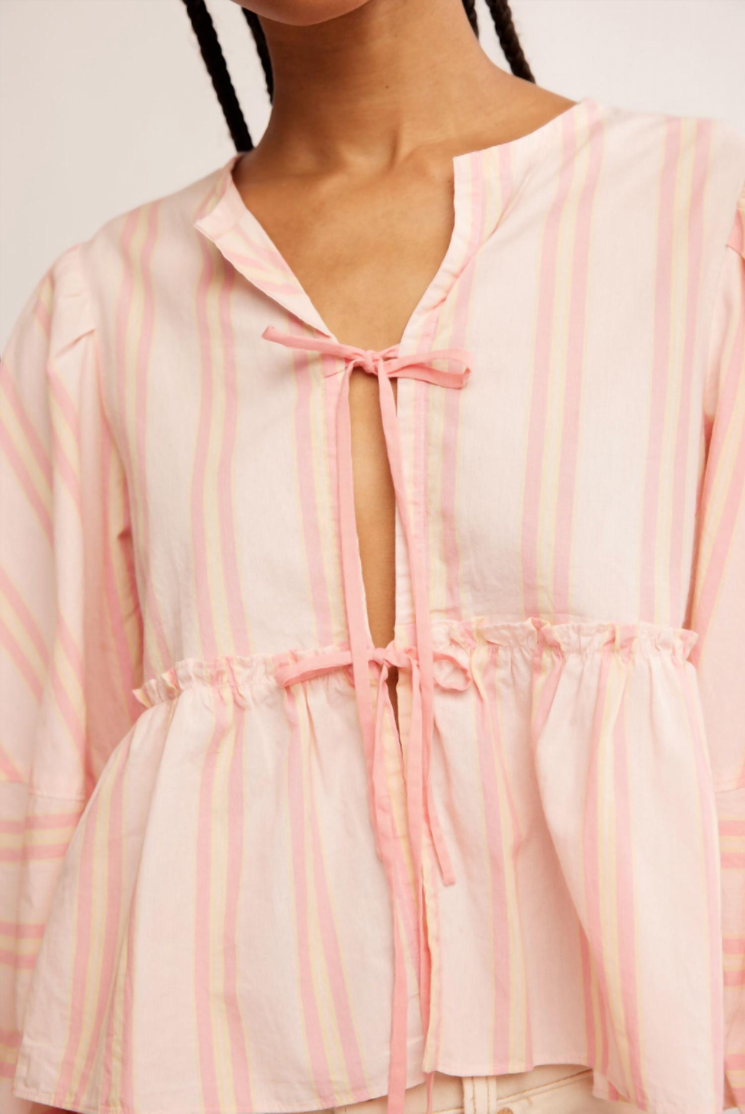 A timeless blouse that will never go out of style. Introducing the Brunch Babe Blouse by Free People, a delightful addition to your wardrobe in a playful pink and yellow stripe pattern. This versatile blouse features long sleeves and a flattering V-neckline, making it perfect for any casual occasion. Crafted from comfortable cotton with a garment length of 22.5 inches, it's designed for easy styling with a convenient pull-on closure. Care instructions: Machine wash to maintain its vibrant look.