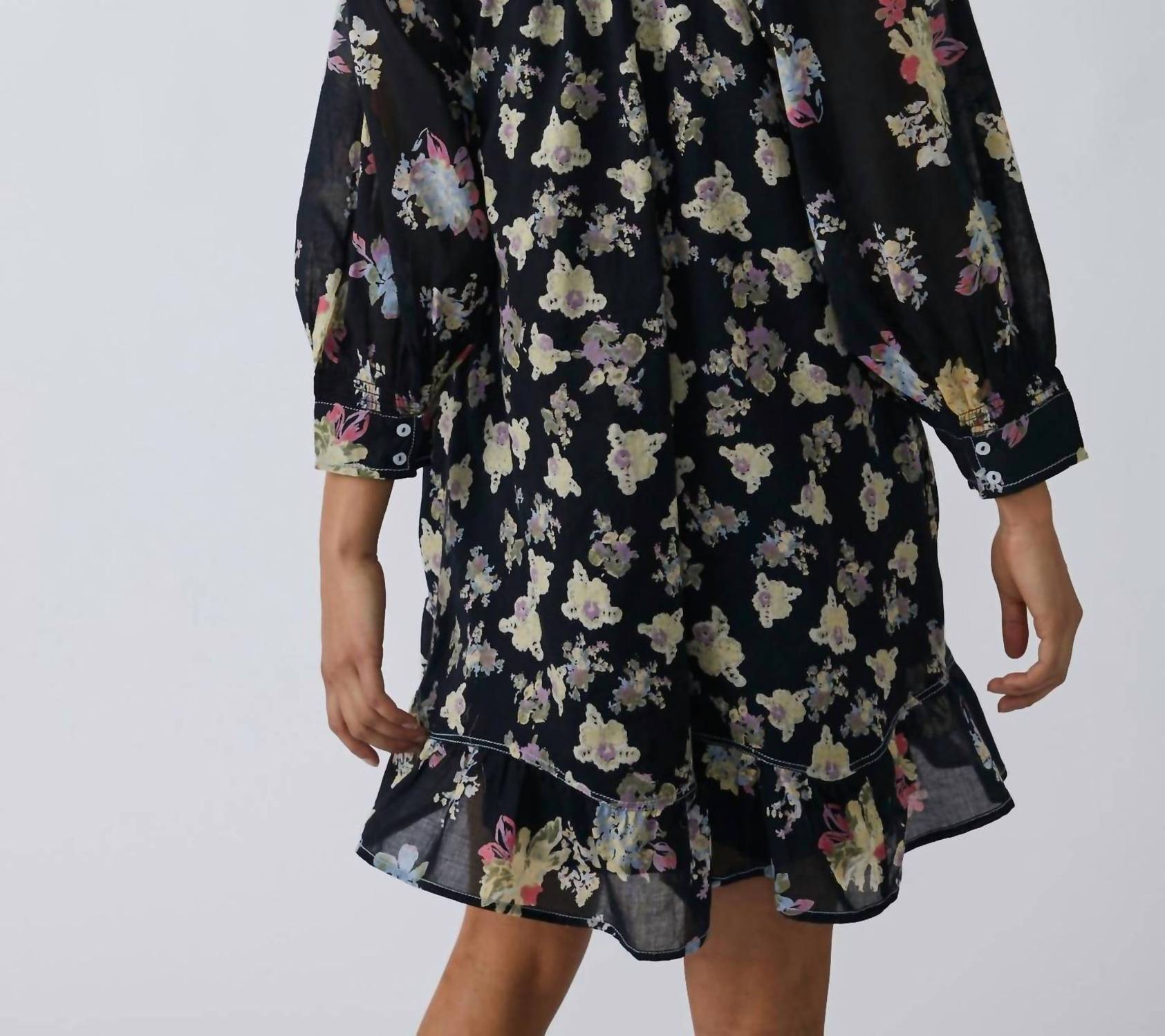 Mini dress featured in a femme floral print with exaggerated sleeves, keyhole feature at front, and ruched drawstring waist at front. Fit: Slouchy, relaxed fit. features: scoop neckline, keyhole detail at front, tassel detailing, defined sleeves, ruffled bottom hem. Main: 100% cotton; Lining: 100% rayon. Machine washable. Imported.