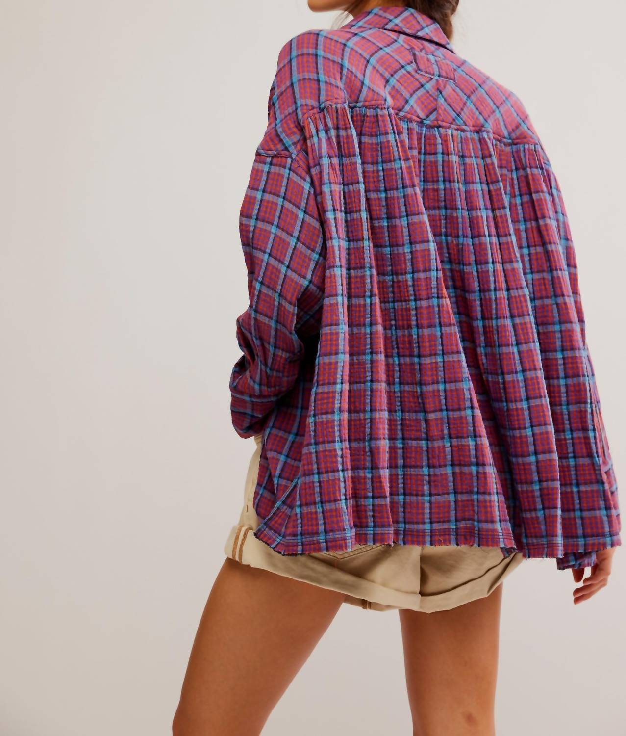 A classic button down shirt that will never go out of style. Elevate your wardrobe with the Cardiff Plaid Button Down Shirt by Free People, a timeless piece in a fashionable purple combo. This shirt features long sleeves, crafted from 100% soft cotton material, offering a billowy, relaxed fit. Measuring 30 inches in length, this versatile piece includes button-front closures, a collared neckline, and double chest-pocket detailing. Made with care, it is imported and easy to maintain with a machine wash cold. Measurements for size small include a 57-inch bust and 18-inch sleeves.