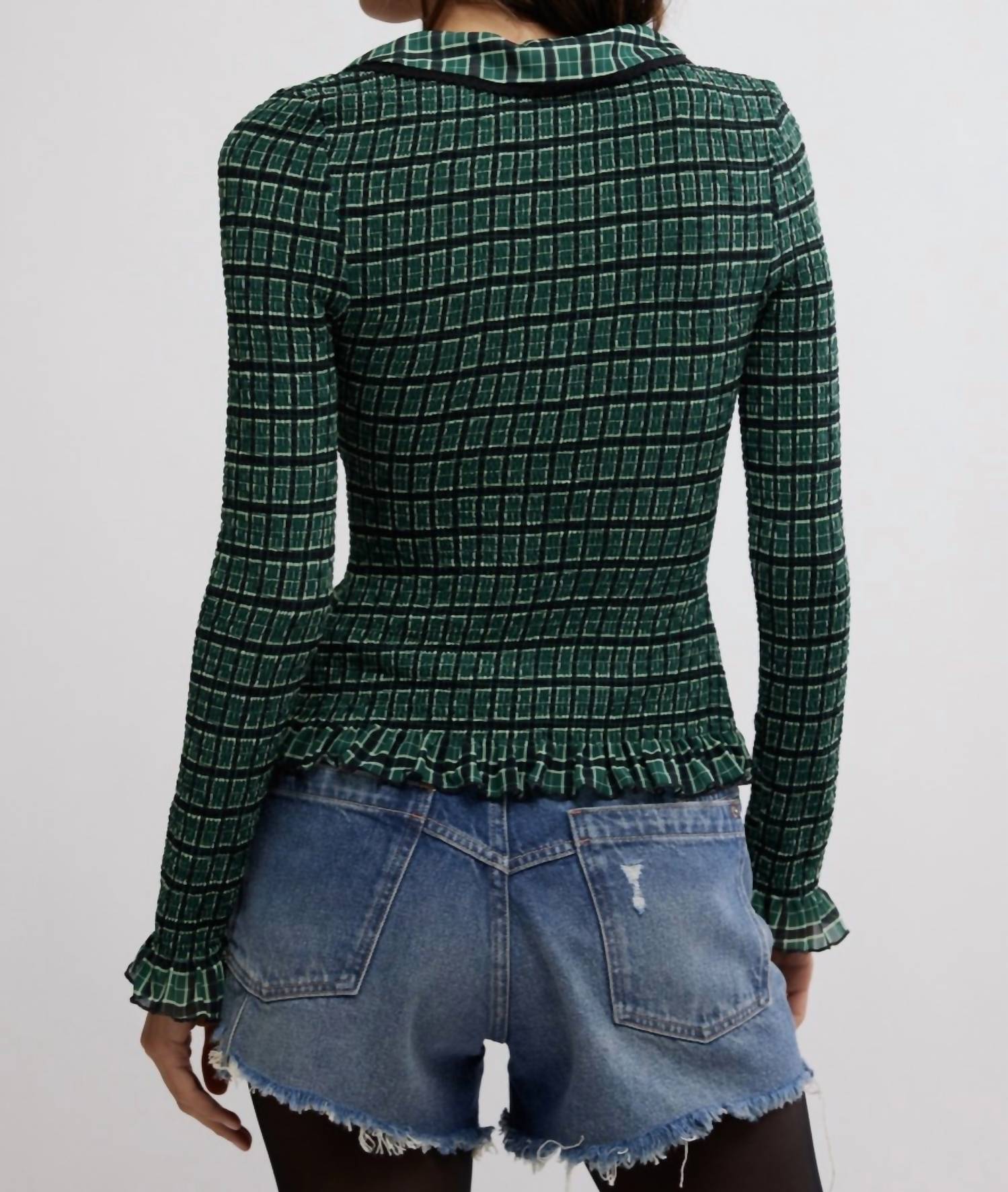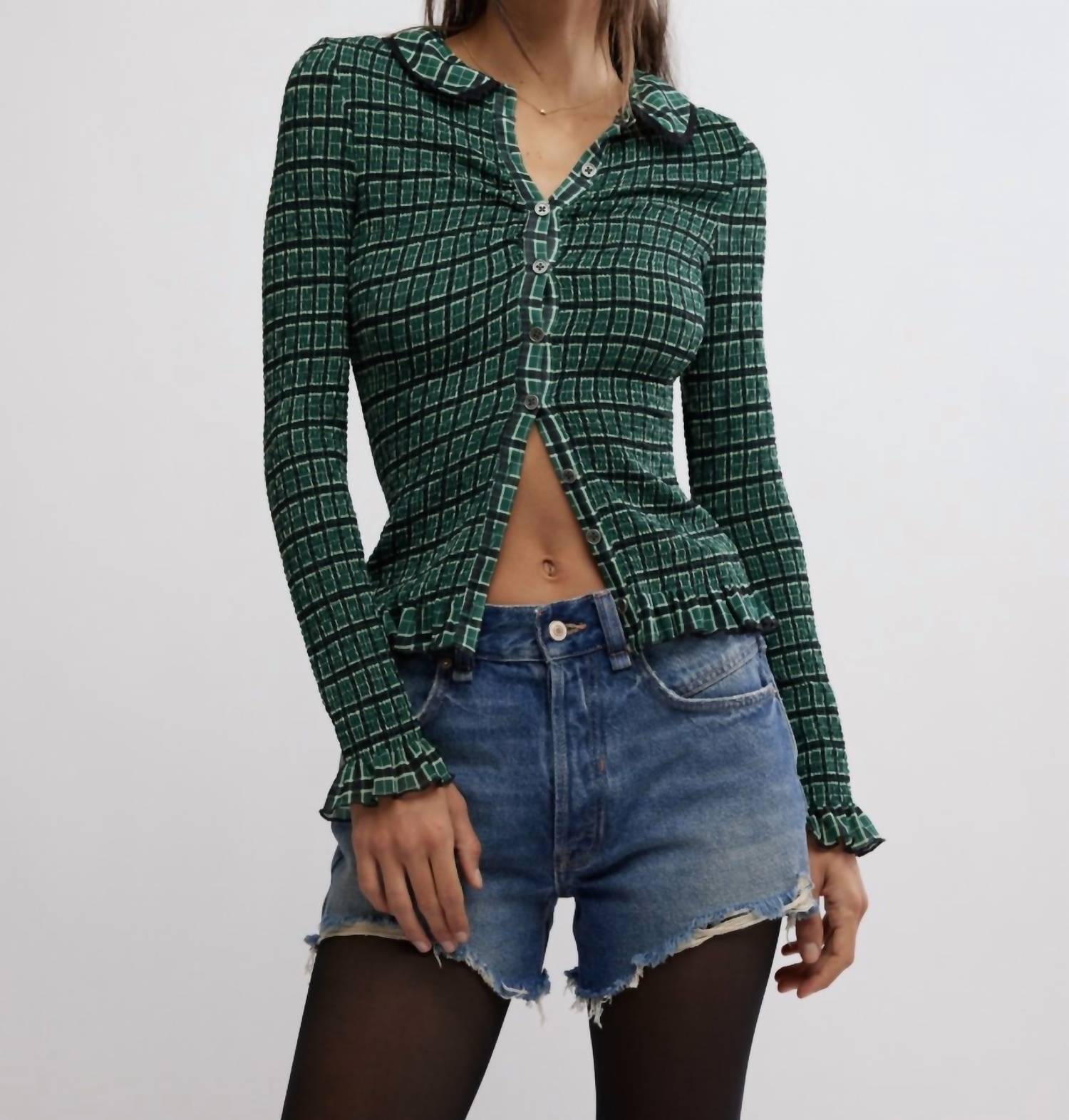 This button down shirt is comfortable yet polished. Introducing the Caught A Feeling Top by Free People, a chic button-down in a vibrant green combo. This smocked top boasts long sleeves with elastic cuffs, featuring a puckered design complemented by flirty ruffles at the cuffs and hem. Composition is 95% nylon and 5% elastane for a comfortable fit. It measures 23" in length and closes with front buttons. Care for this imported piece includes hand washing and drying flat.