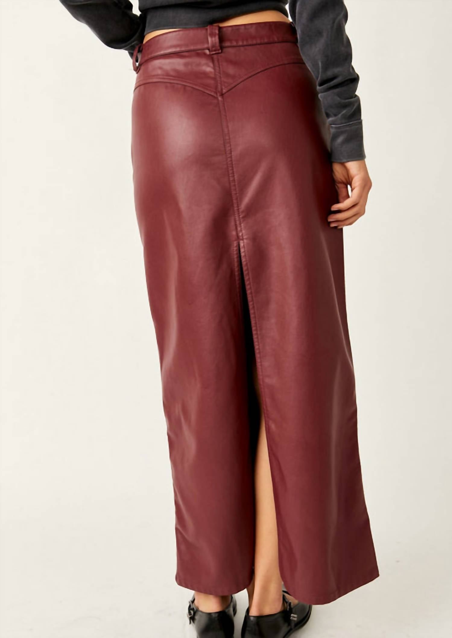 Tuck in your favorite tee for a more casual yet feminine look. Elevate your style with the City Slicker Skirt by Free People, presented in a rich wine hue. This vegan leather maxi skirt features a fitted silhouette with an alluring slit, crafted from 100% viscose with a coated polyurethane finish. The design includes practical pockets and is secured with a button closure. For care, simply machine wash cold on a gentle cycle.