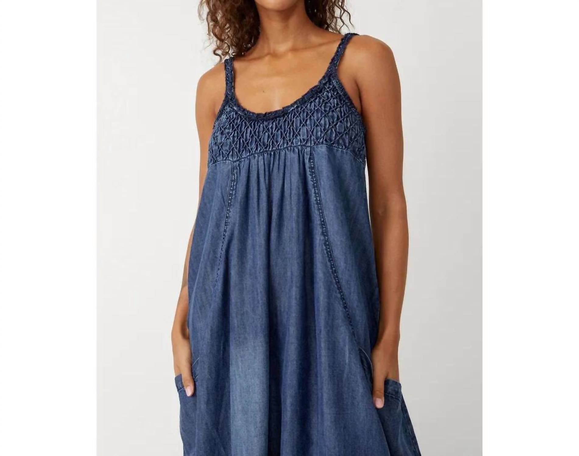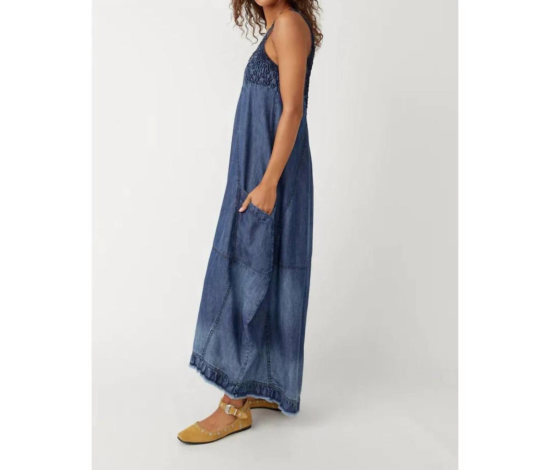 This billowy maxi is featured in a soft chambray fabrication and shapeless silhouette with a classic scoop neckline and low open-back. Machine wash cold. 67% Cotton, 33% Lyocell.