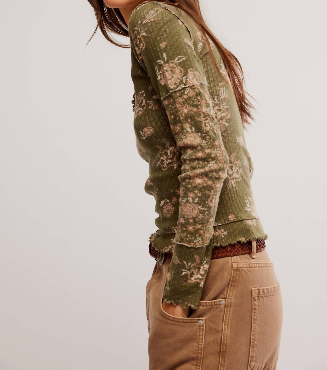 The perfect long sleeve tee that goes with just about anything. Discover the Clover Printed Thermal by Free People in an Army Combo camouflage print for a relaxed, heritage-inspired look. This classic long sleeve tee features a slim fit through the arms, a low scoop neckline, and exposed seam details, crafted from a soft cotton blend. Made for layering, its 24-inch length and layered hem with lettuce-edge trim add to its versatility. Closure: Pull on, Care: Machine wash cold. Size Small measurements: 30-inch bust, 24-inch length.