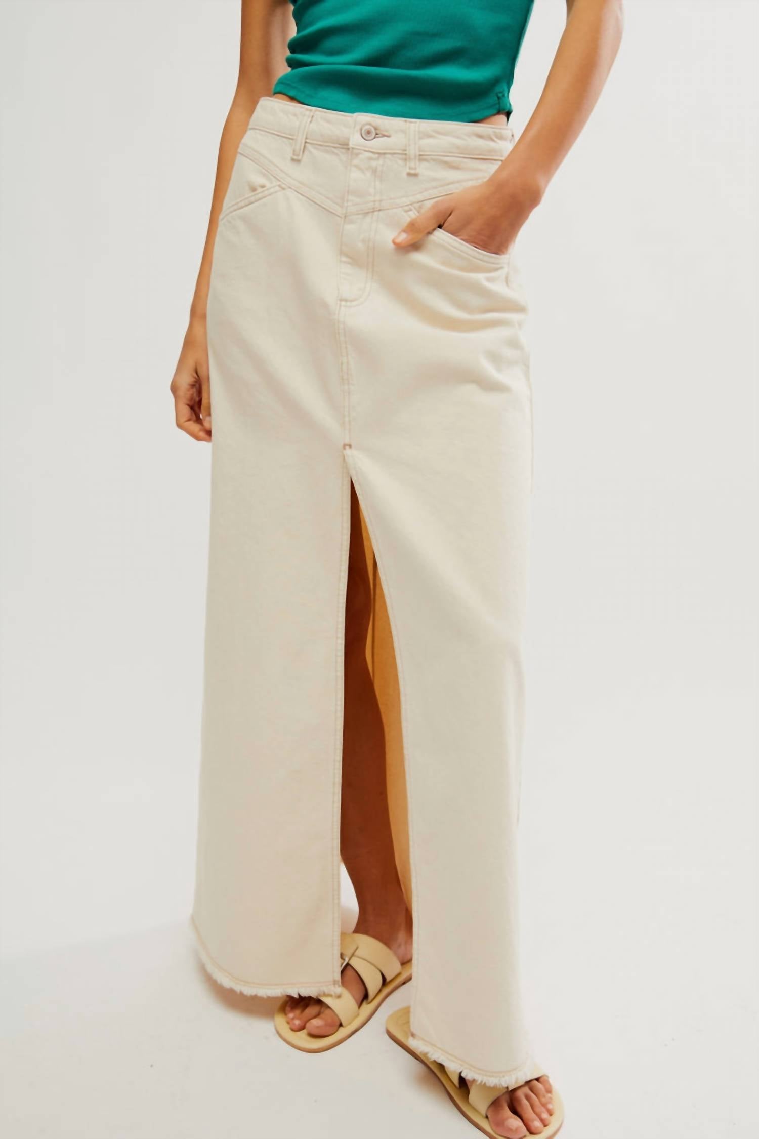 Maxi length skirt. Mid-rise. A-line silhouette and rigid denim. Zip fly and button closure. Four-pocket design. Inverted yoke seam at front. Raw-edge hem. Machine wash cold. 100% cotton.