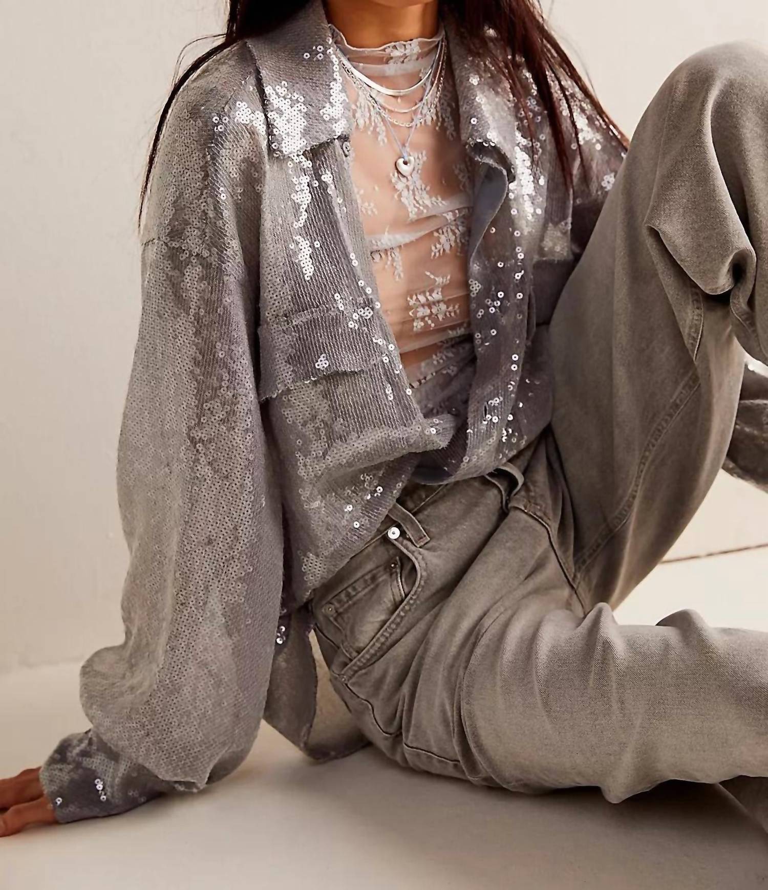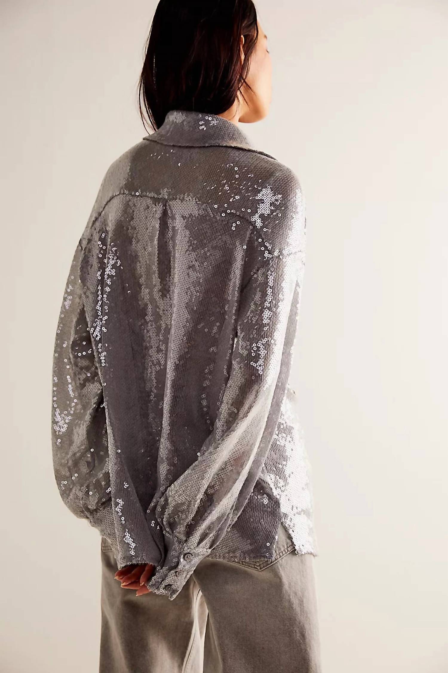 A classic button down shirt that will never go out of style. This sequin-adorned shirt features a slouchy, oversized fit with a classic silhouette. It has a cool collared neckline, chest-pocket detailing, and drop-shoulder sleeves with cuffs. Made from 95% polyester and 5% elastane, it has a length of 29" (size small). Hand wash cold. Imported.