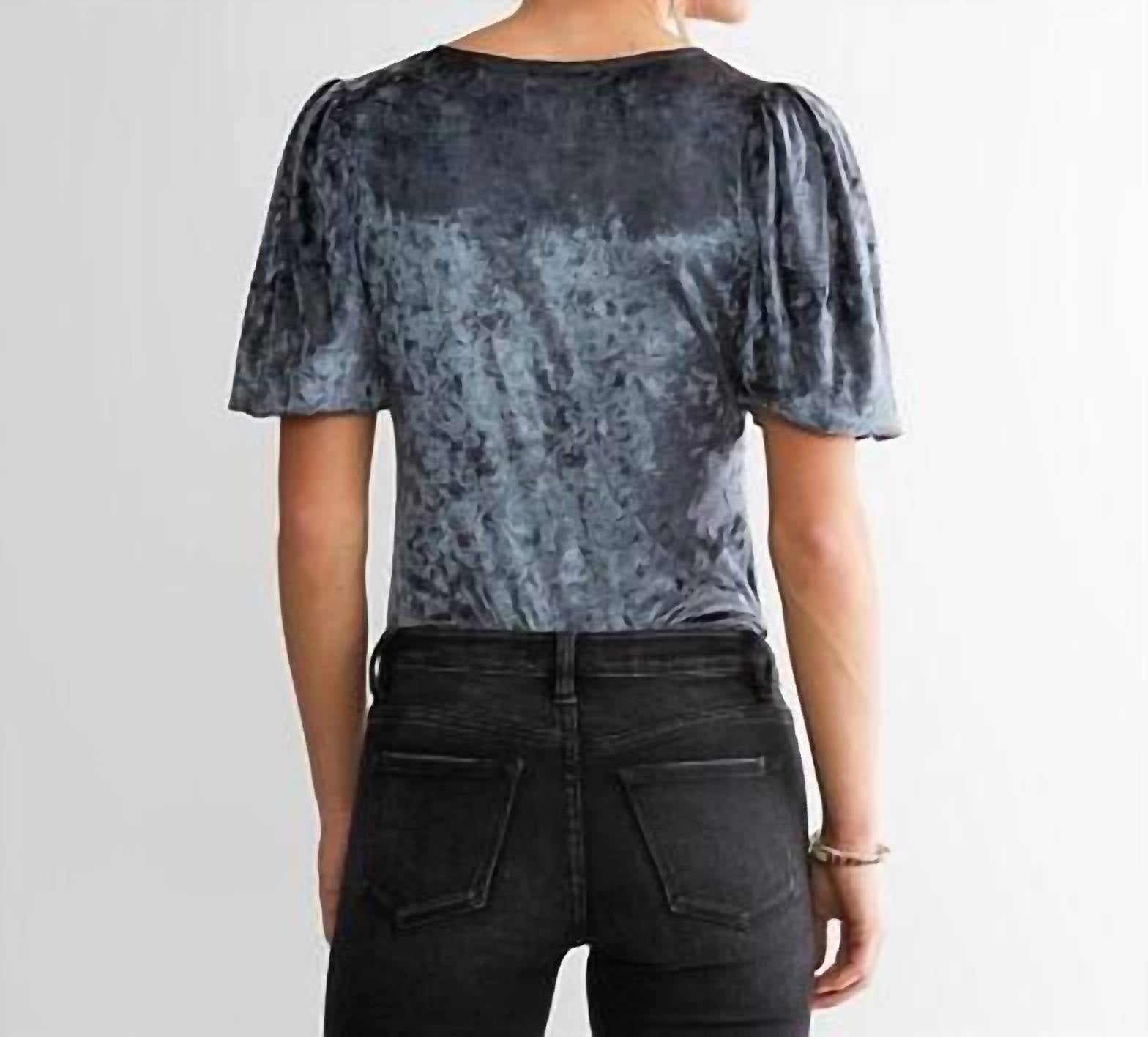 Introducing the "Don't You Wish Bodysuit" by Free People, a chic addition to your wardrobe that exudes elegance with its form-fitting silhouette and flirty design. This silver velvet bodysuit features elasticized puff sleeves and a v-neckline for a touch of glamour. Composition: 95% Polyester, 5% Elastane. Bust measures 32" and body length 26" on size small, with thong bottom and convenient snap details. Perfect for any occasion where you want to stand out and shine.