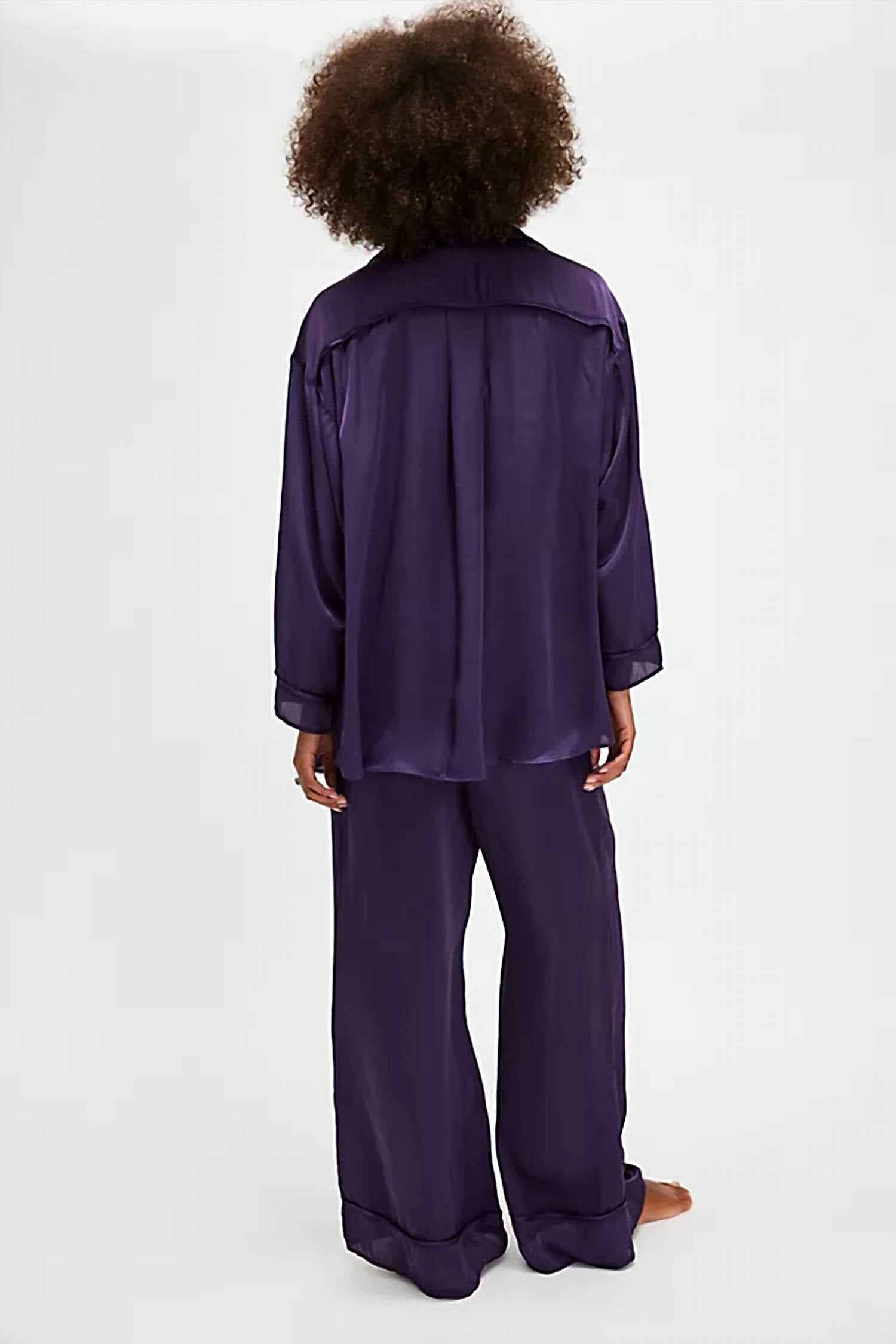 The perfect piece to lounge in, sleep in, and cook breakfast in. This dreamy long-sleeve pajama set features a relaxed, oversized fit with a satiny fabrication. The top has drop-shoulder sleeves, a collared neckline, and a button front closure. The bottoms are mid-rise with wide legs and an elastic waistband with a drawcord. Made from 100% polyester, machine wash cold. Imported.