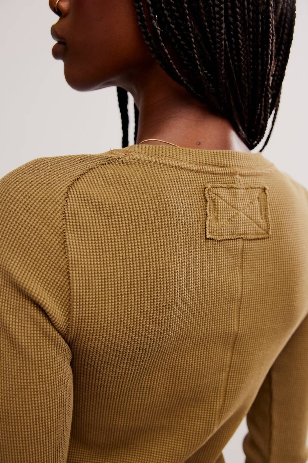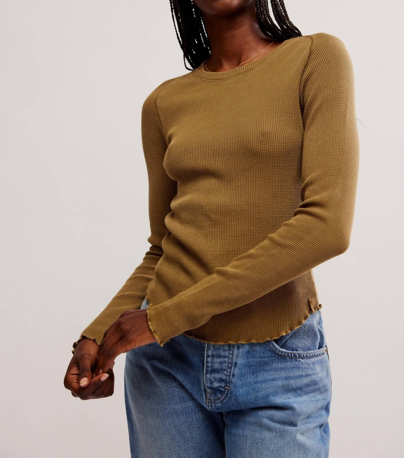 A long sleeve top you can wear with denim, skirts, well... just about anything! Introducing the Easy Does It Longsleeve Top by Free People, a wardrobe staple in a military olive hue. Crafted with long sleeves, this tee boasts a soft waffle-knit fabrication, offering a slim yet relaxed fit at hip-length. Made from a durable cotton blend (95% Cotton, 5% Spandex), it features a crewneck and raglan-cut sleeves with stylish lettuce-edge trim. Origin: Imported with a pull-on closure. Care: Machine wash cold. Model is wearing a size small (Bust 28", Sleeve 28.5", Length 23.25").