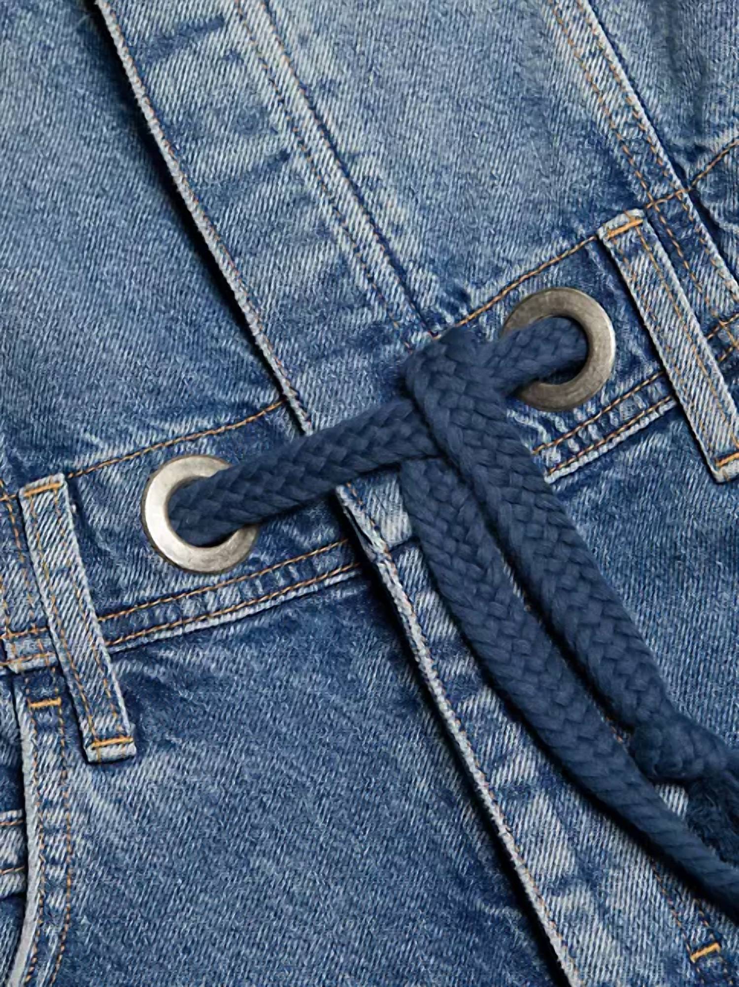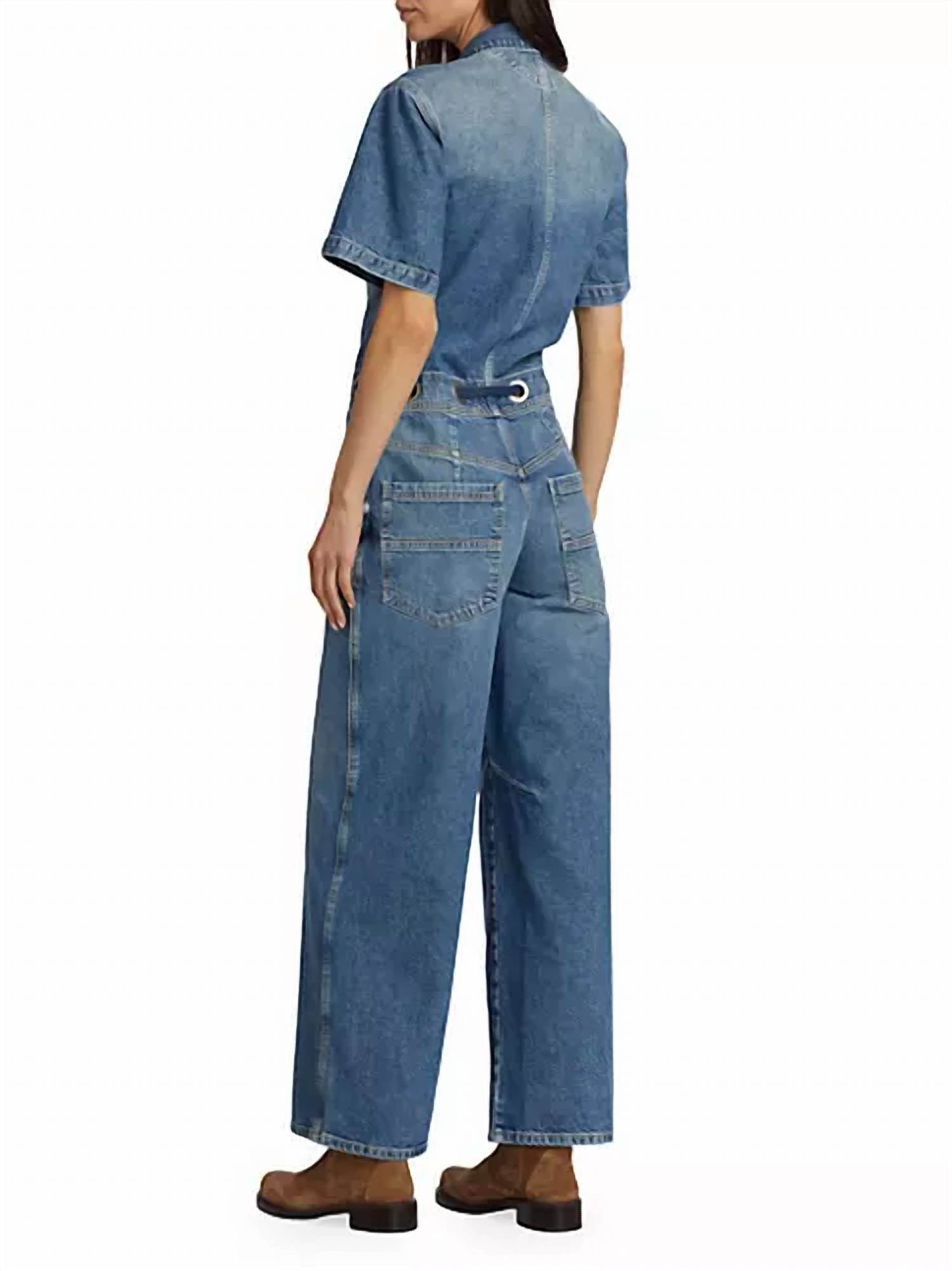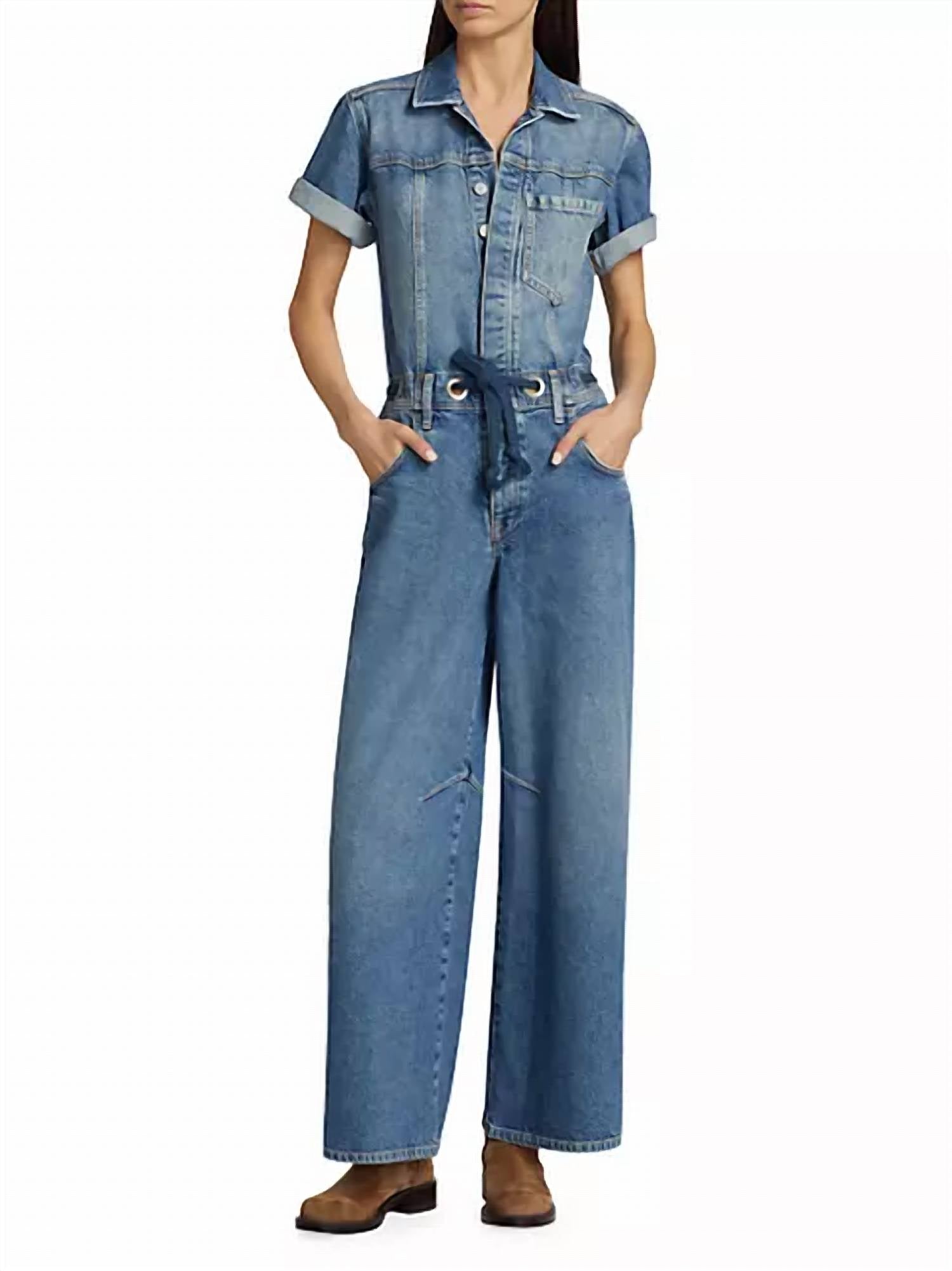 Inspired by classic workwear styles. Designed with a wide-leg silhouette. Spread collar. Short sleeves. Chest patch pocket. Self-tie drawstring waist. Five-pocket style. Seamed knees. 100% cotton. Machine wash. Rise: about 10.5”. Inseam: about 30.25”. Model measurements: 5'10” tall. Model is wearing a US size Small.