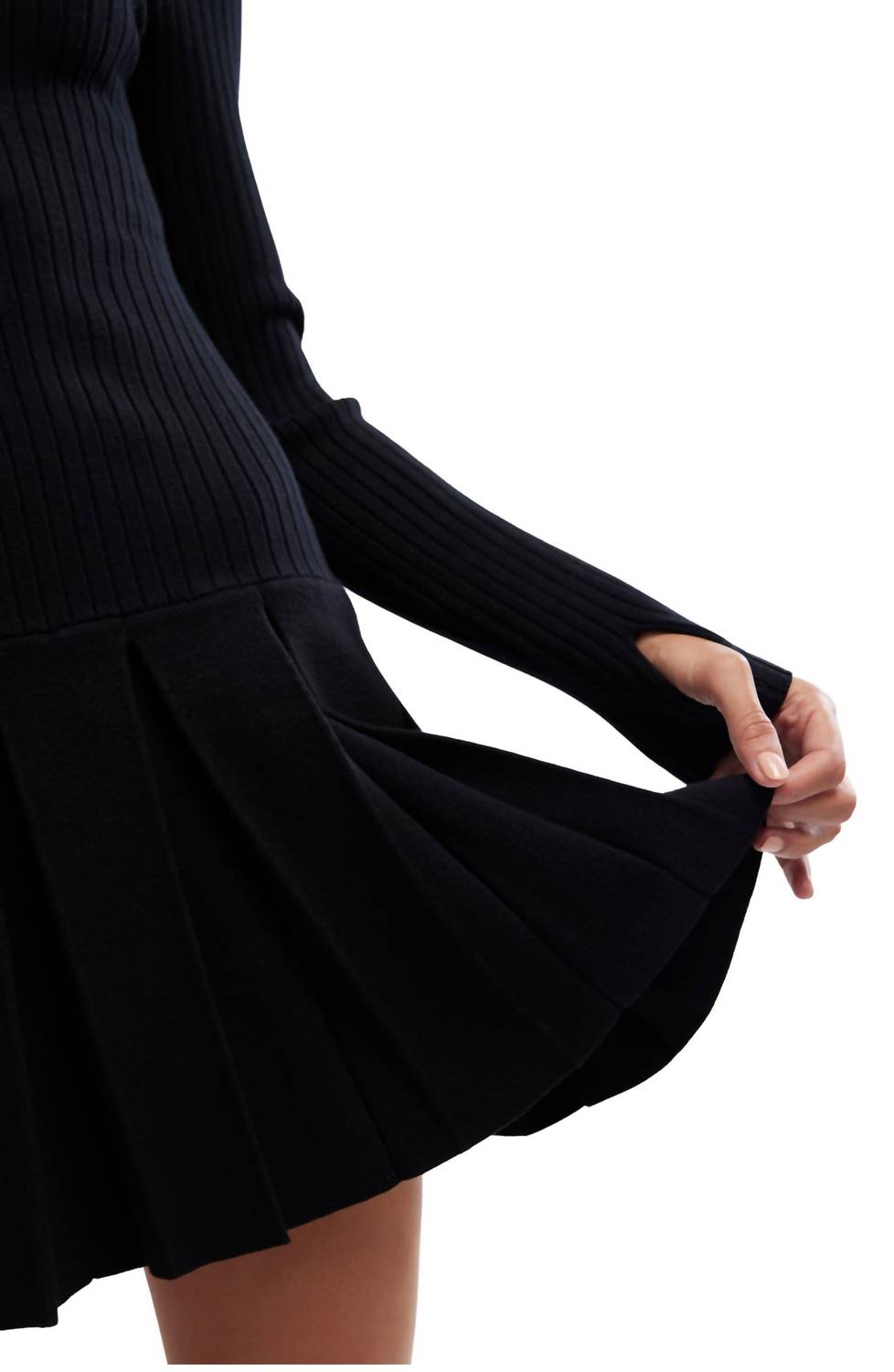 The kind of easy and flattering dress you'll be reaching for all season long. This long-sleeve mini dress sweater features thumbhole cuffs, a pleated skirt, and a band collar. It has an open back with a snap button closure, pull-on styling, and is unlined. Made from 61% viscose, 27% polyester, 11% polyamide, and 1% elastane, it measures approximately 30" in length. Hand wash and dry flat. Imported.
