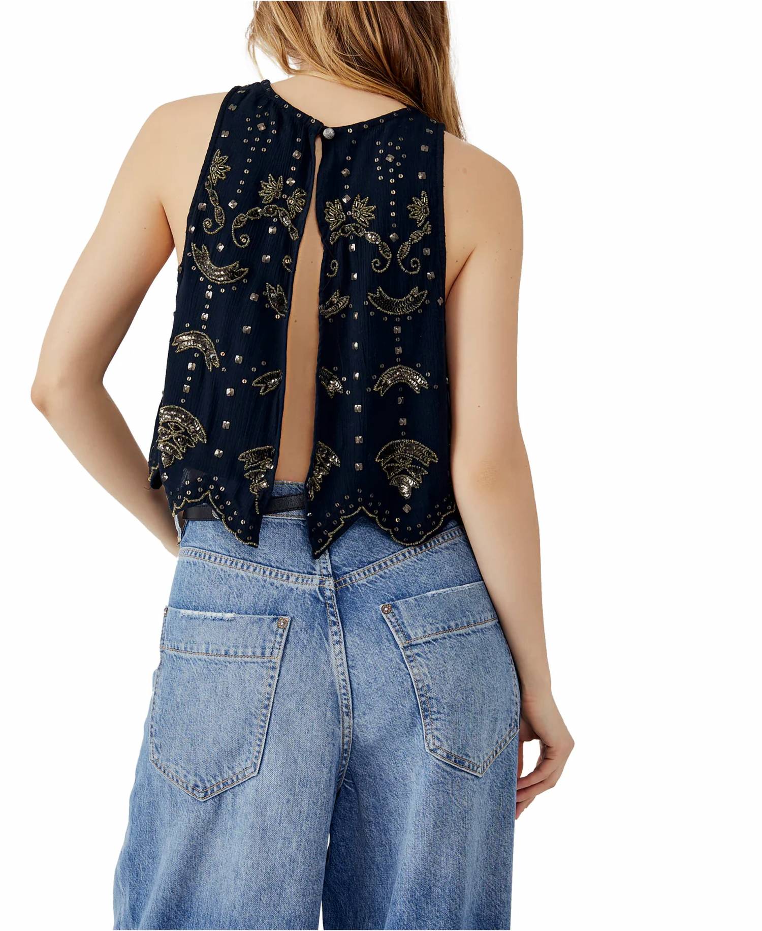 Back loop button closure. Sequin and beaded embellishments throughout. Self: 100% Viscose. Lining: 100% Modal. Hand wash. Made in India. Model is 5'9" and is wearing a size XS.