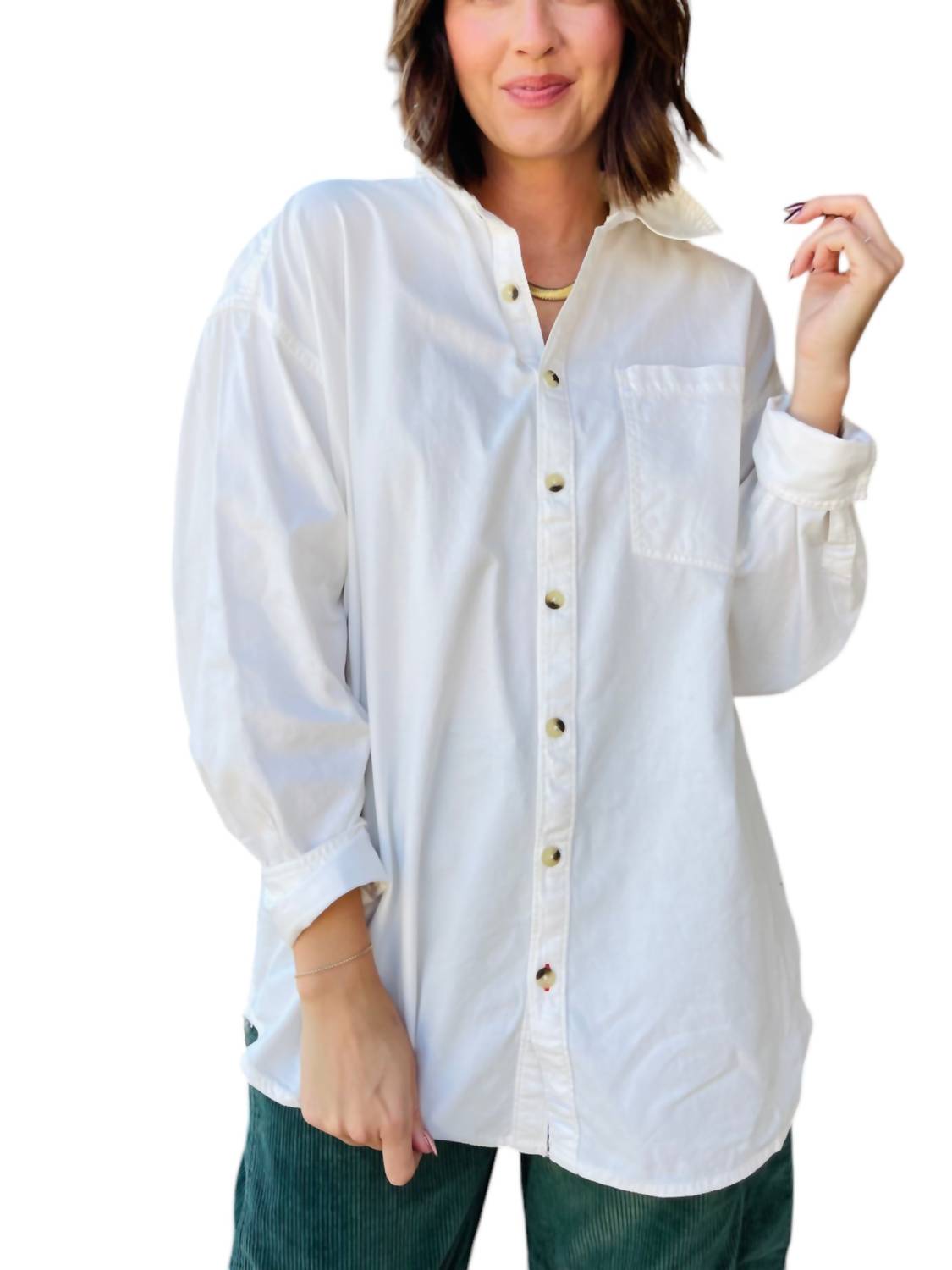 The perfect button-down from the We the Free Collection, this classic shirt is made from cool cotton with an oversized fit, dropped shoulders, and a collared neckline. Its slouchy, menswear-inspired style goes with everything. Fabric: 56% Cotton, 44% Viscose. Measurements from Small: Bust: 57 in, Sleeve: 21.75 in, Length: 35 in. Care: Machine wash cold.