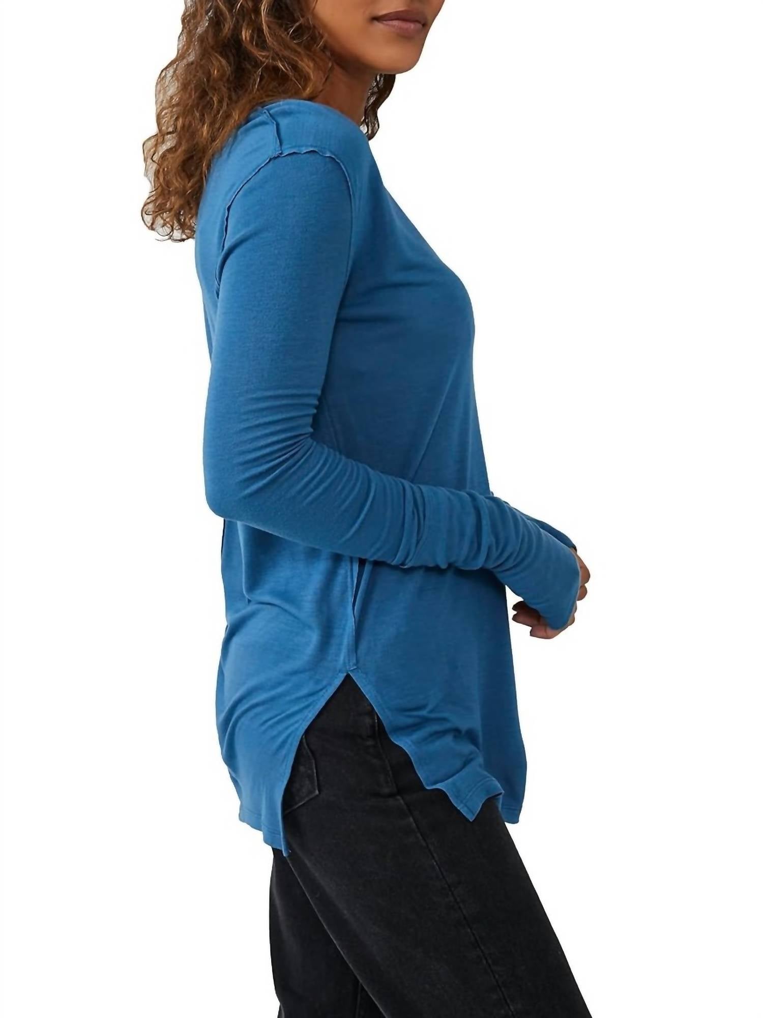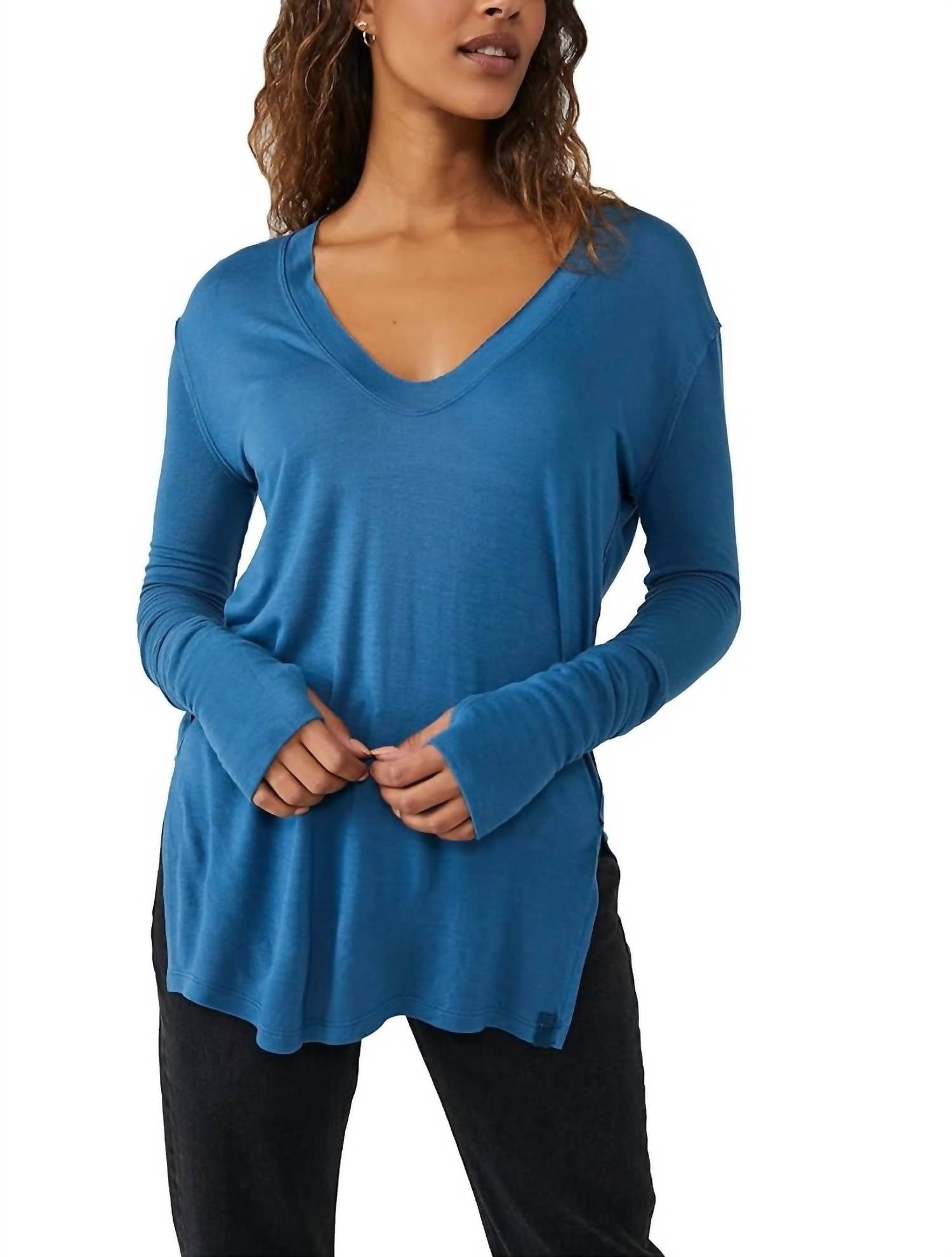 Regular fit. Long sleeves with thumbhole detail and deep V-neck. Side slits at the hemline. Pullover construction. Fabric: 100% Rayon. Machine wash.