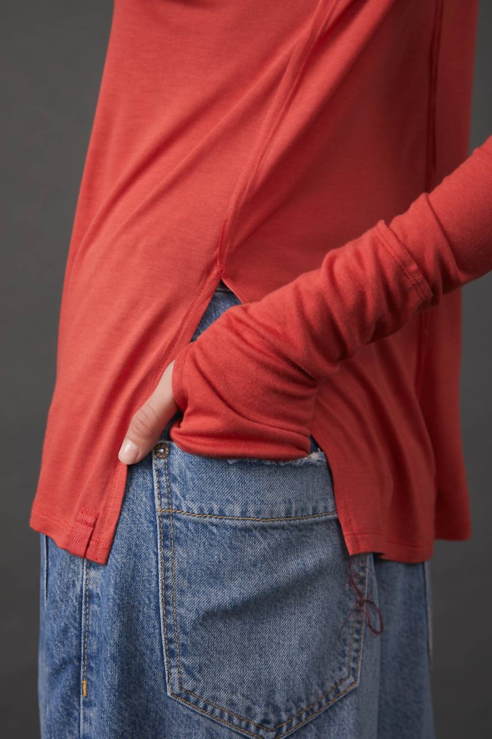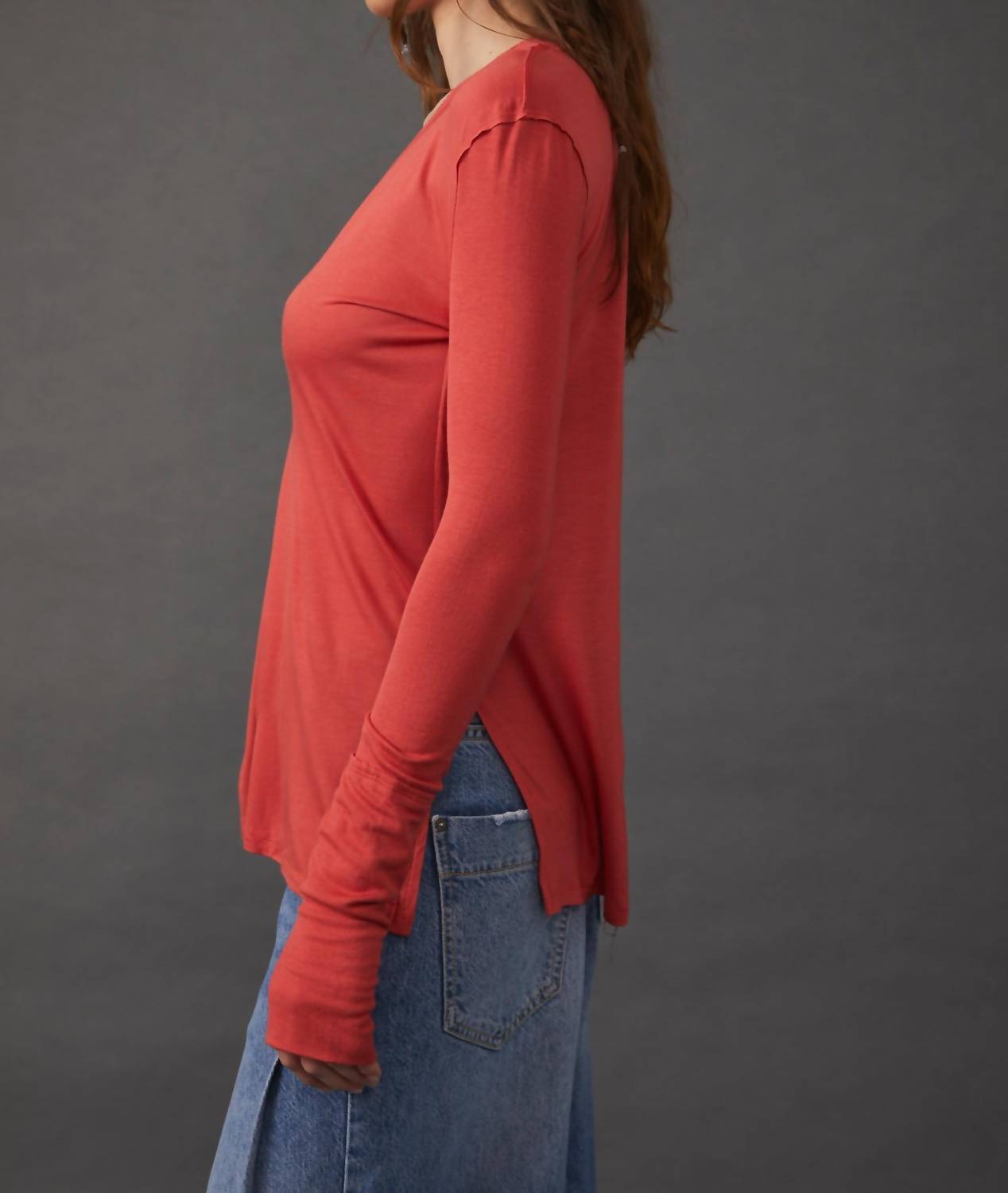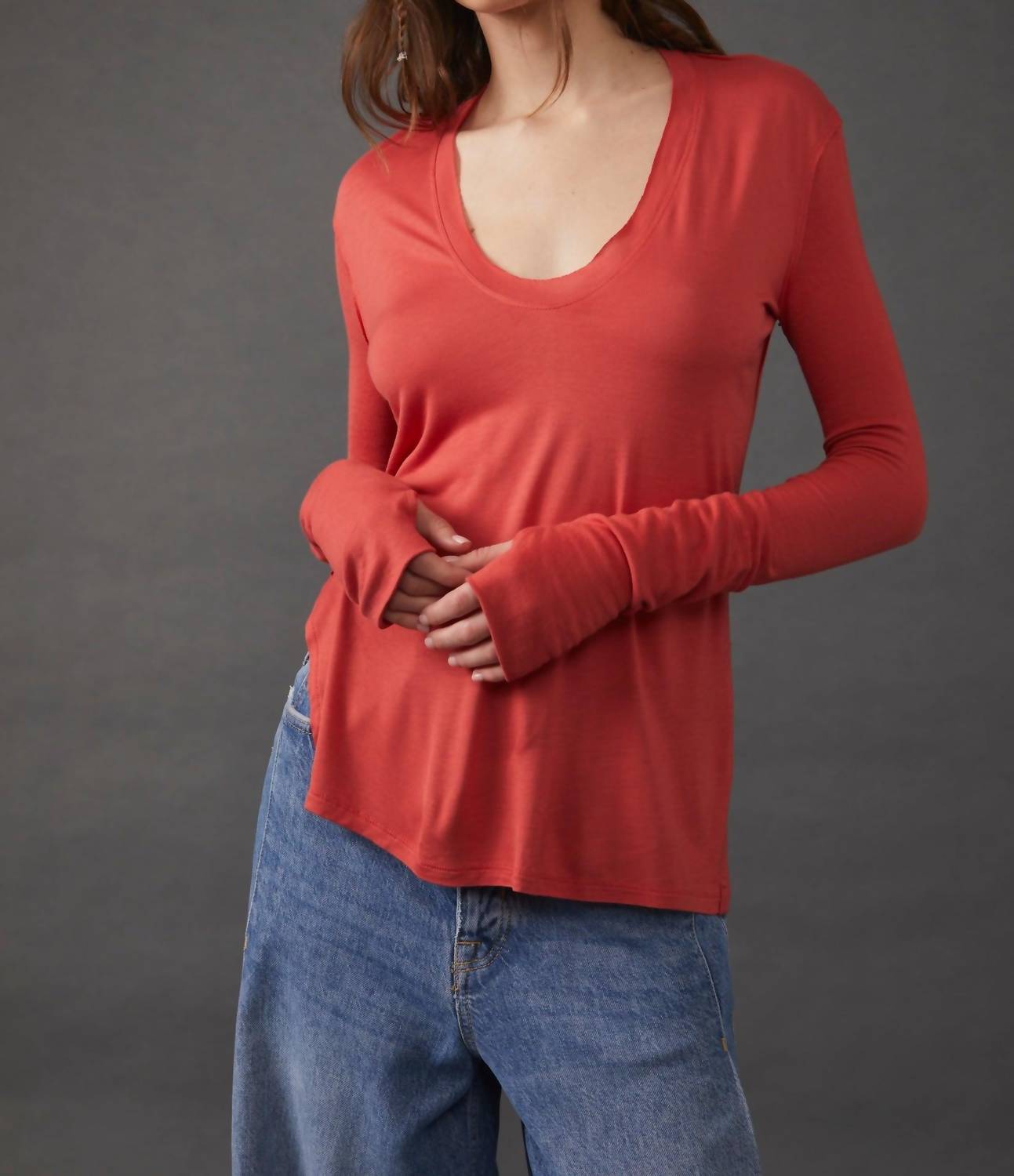 Bright red long sleeve lightweight top. Lovey as a layer or simply styled solo, this forever timeless tee is featured in a classic long sleeve silhouette with exposed seaming and side slits at bottom for added shape. Scoop neckline. Front patch pocket. Thumbhole detail. Machine Wash Cold Gentle. Measurements for size small: Bust: 37.5 in. Length: 27.5 in. Sleeve Length: 27.5 in. 100% Viscose. Lining: 96% Viscose, 4% Elastane