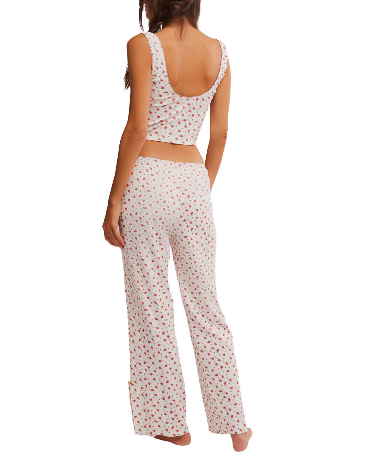A set so cute you'll never want to take it off. Designed to look good while lounging, this little number is the perfect outfit for hanging at home in style. This 2-in-1 set includes a top and matching pant. The top features a ditsy floral print, pointelle knit fabrication, a sweetheart neckline, and is sleeveless with a pullover construction. The matching pant has the same ditsy floral print and pointelle knit fabrication, with side slits and a pull-on construction. Made from 95% cotton and 5% spandex. Machine wash cold, line dry. Imported.