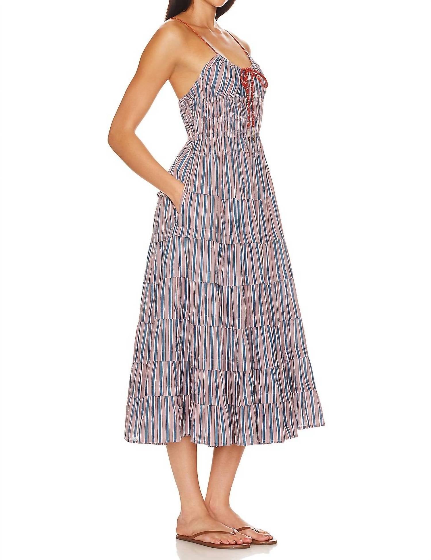 This midi-length dress features a front drawstring closure and an elastic bodice strap, allowing for an adjustable fit. Crafted from a cotton blend, the tiered broadcloth fabric showcases stylish stripe details and includes convenient side seam pockets for added practicality. Designed with a relaxed fit, it offers both comfort and elegance. The dress is partially lined for enhanced quality. The model is 5'9" and is wearing size XS. For care, machine wash is recommended to keep it looking fresh. Made in India.