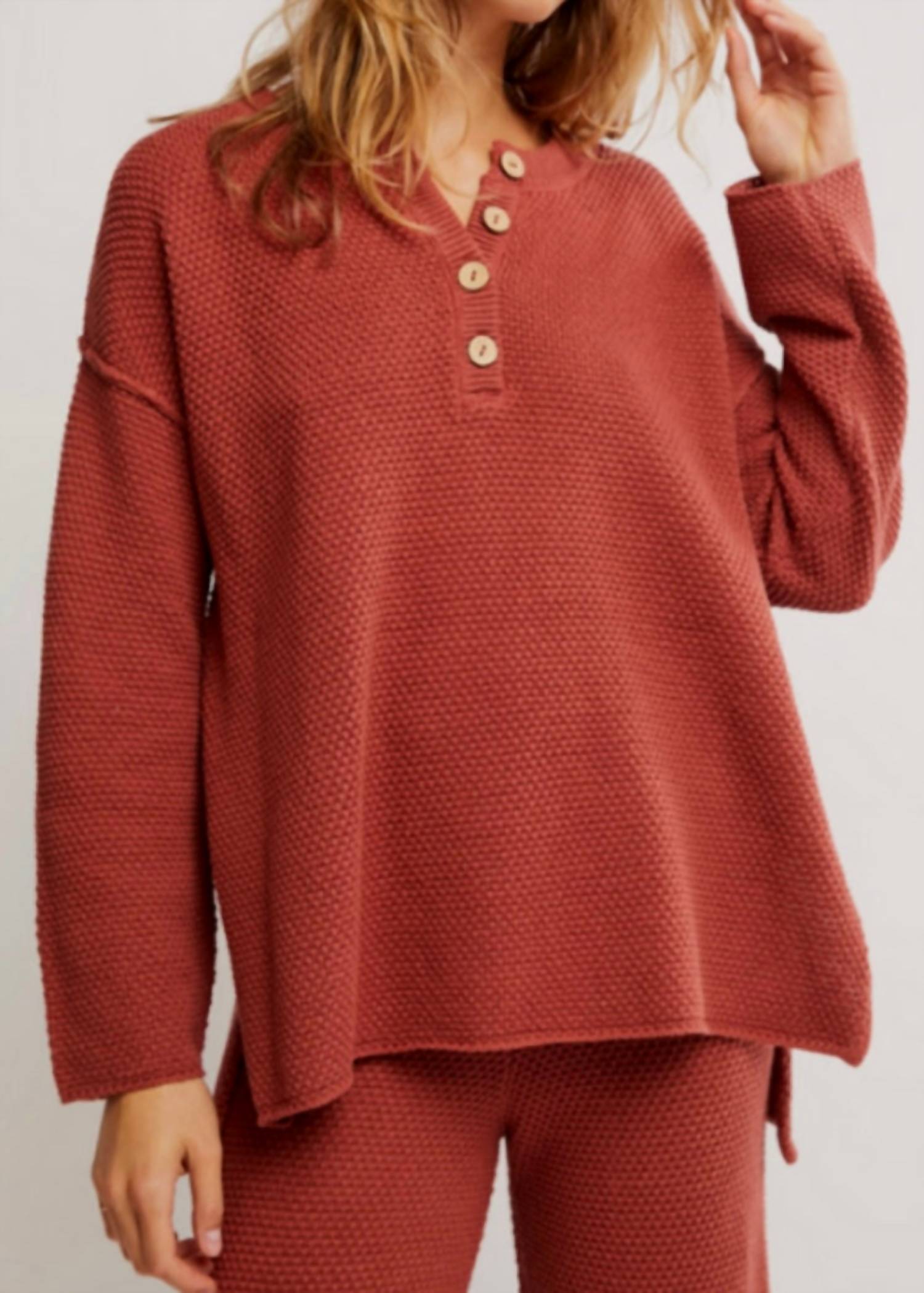 Loungewear doesn't have to be frumpy and this is exactly what we had in mind. Designed for a comfortable fit, this chic little number will be your favorite lounging-at-home look. Discover the effortlessly chic Hailee Set by Free People, designed to offer ultimate comfort with its soft waffle-knit fabrication. Featuring a scoop henley neckline and long, dropped raglan sleeves, this loungewear set promises relaxed elegance in solid red. Made from 100% cotton, the high-rise pants come with a practical elastic waistband and pull-on style, perfect for minimalist summer lounging or casual Thanksgiving gatherings. Care: Machine wash.