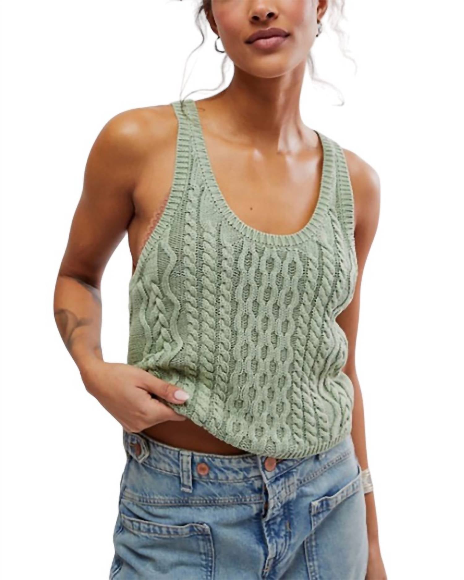 Fit, fabric and functionality. This tank top checks all the boxes. The Free People High Tide Cable Knit Tank Top in Green Tea is a stylish addition to any wardrobe. Featuring a scoop neckline and a slouchy, cropped silhouette, this sleeveless tank is an ideal piece for layering or wearing solo. Made from 100% cotton, it offers a textured appearance with ribbed hems and a racer-style back for added flair. Closure: Pull-on. Care: Hand wash separately, do not wring or twist, use non-chlorine bleach, re-shape, lay flat to dry, iron low, do not dry clean. Model Alyssa is 5'10" and is wearing a size small.