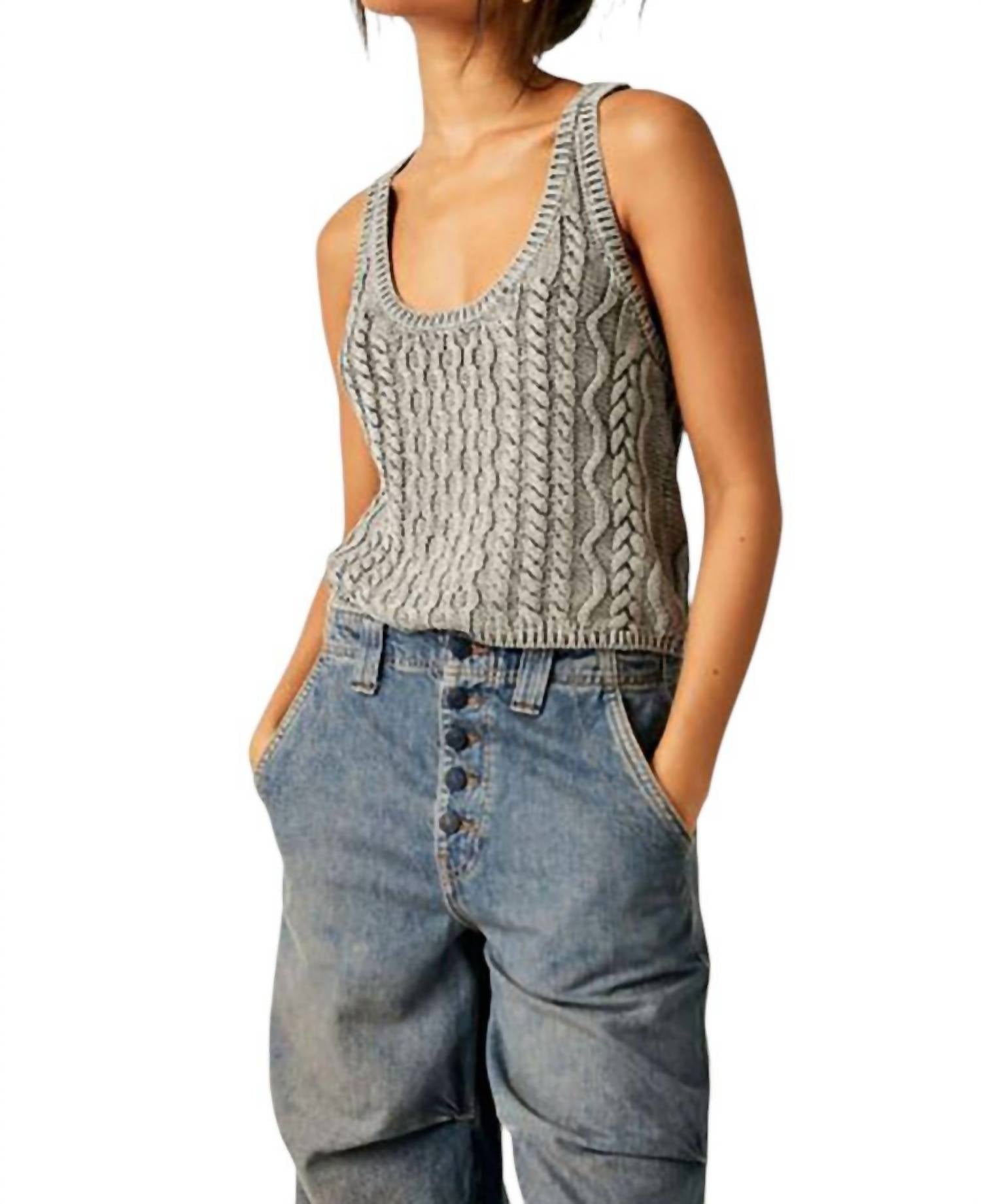 The High Tide Cable Tank Top by Free People is a versatile sleeveless piece crafted from cotton. It features a slouchy, slightly cropped silhouette, scoop neckline, and racer-style back, with classic cable knit detailing. With a relaxed fit, it’s perfect for layering or wearing alone. For size small, the bust measures 31 inches and the length is 19 inches. Care: hand wash cold. Imported.