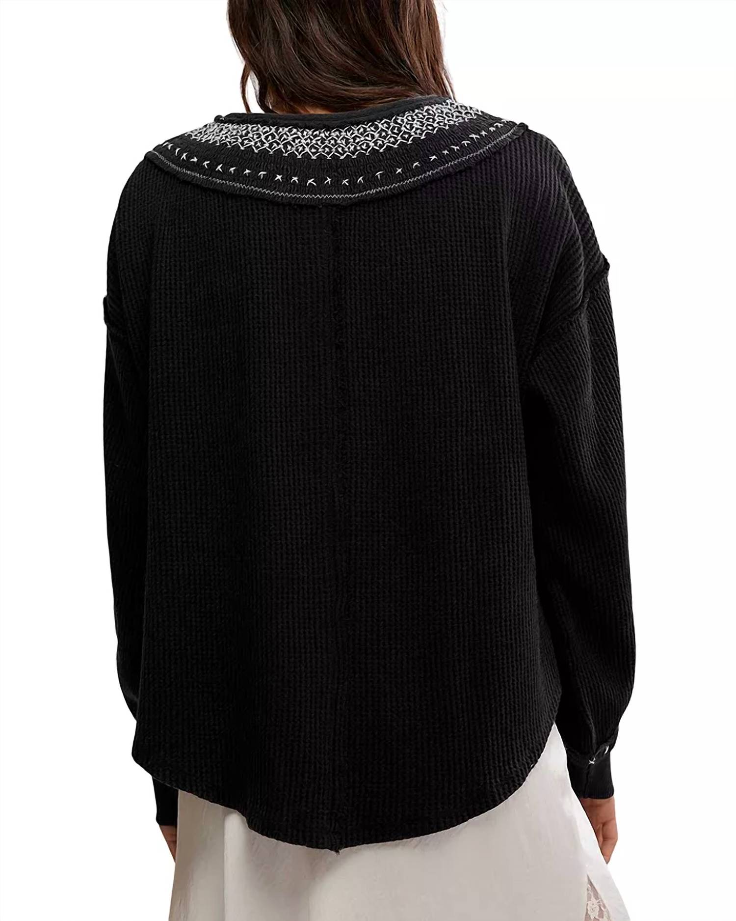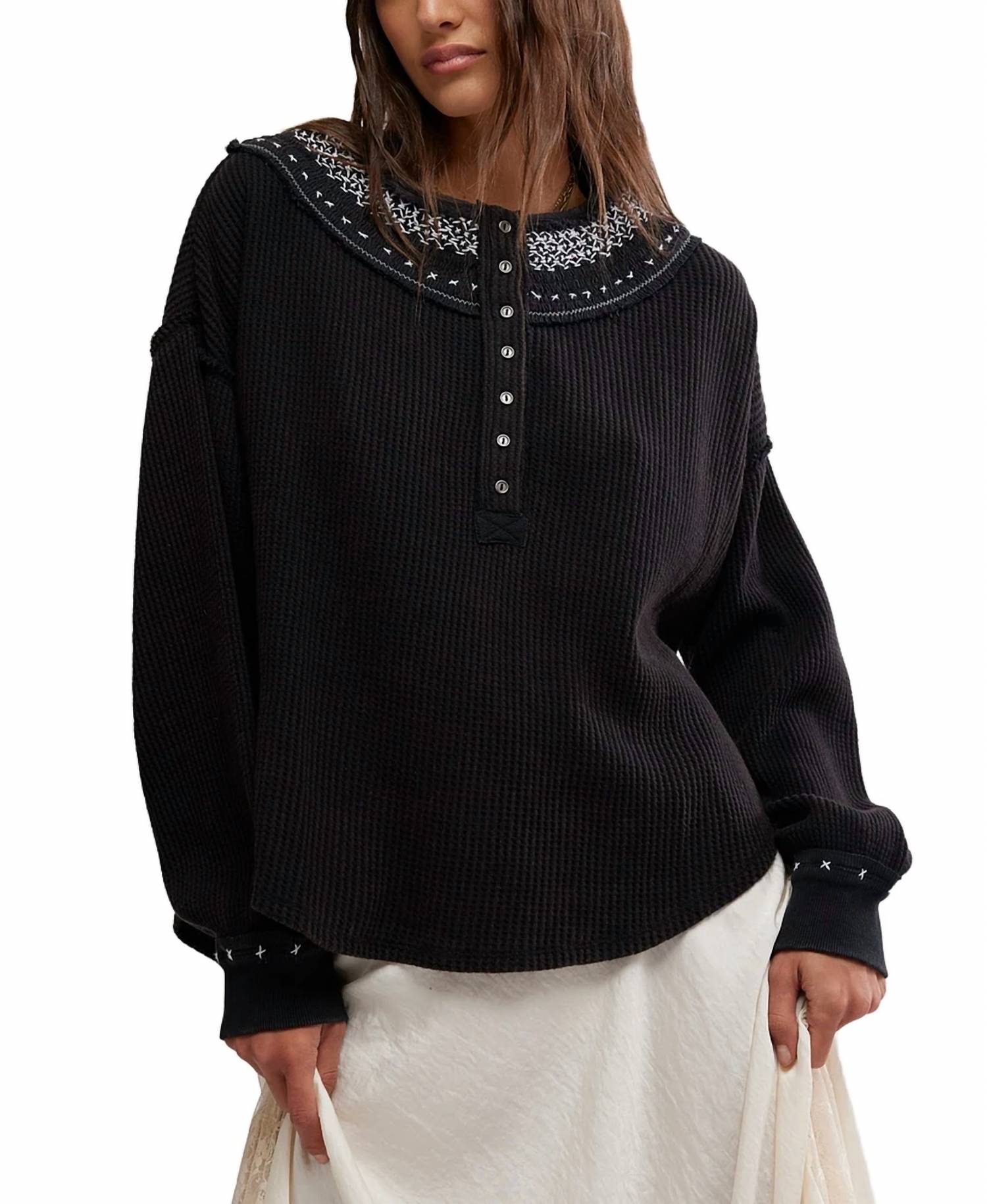 Discover the effortless style of the Holly Henley Sweater by Free People, a timeless addition to your wardrobe. This women's sweater features a classic crewneck and long sleeves, crafted from soft cotton for ultimate comfort. The solid black hue makes it versatile, while the button closure adds a hint of traditional flair. Perfect for layering or wearing on its own, this sweater is both chic and practical.