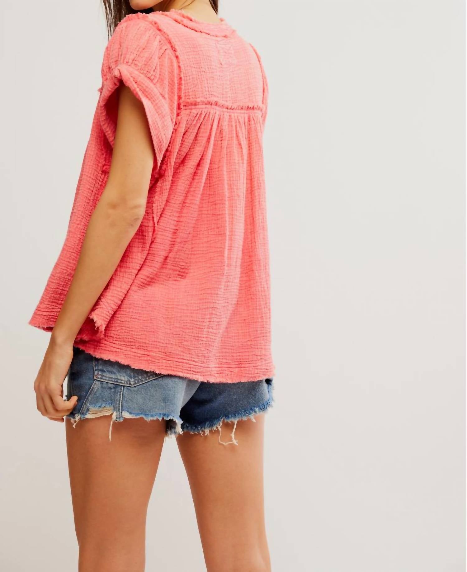 Swingy oversized fit of this gauzy top designed with a buttoned half placket and abbreviated sleeves. 26" length (size Medium). Band collar. Split neck. Short sleeves. 100% cotton. Dry clean or machine wash, line dry. Imported.
