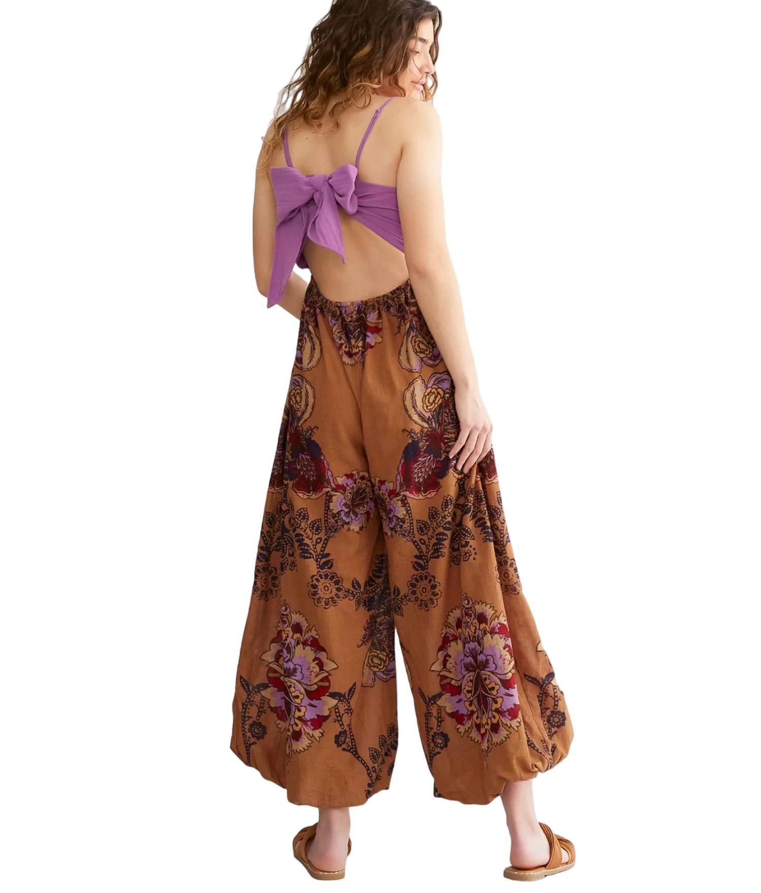 Floral print embroidered woven lined jumpsuit. Open back tie detail. Elasticized waistband. Removable straps. 27" Inseam. 28" Bust on size small. Body length up to 56" on size small. Machine wash cold. 100% Cotton. Lining 100% Viscose.