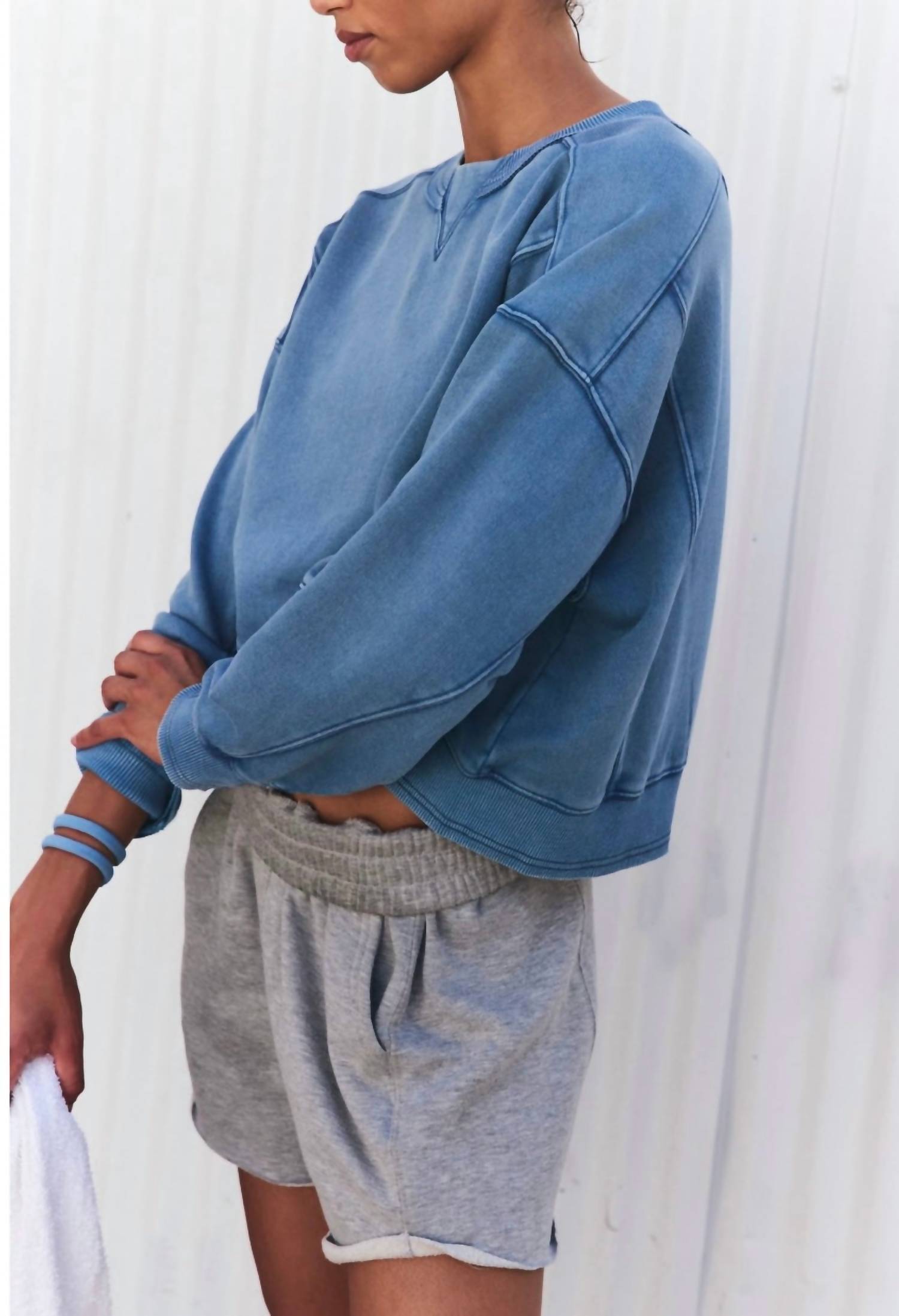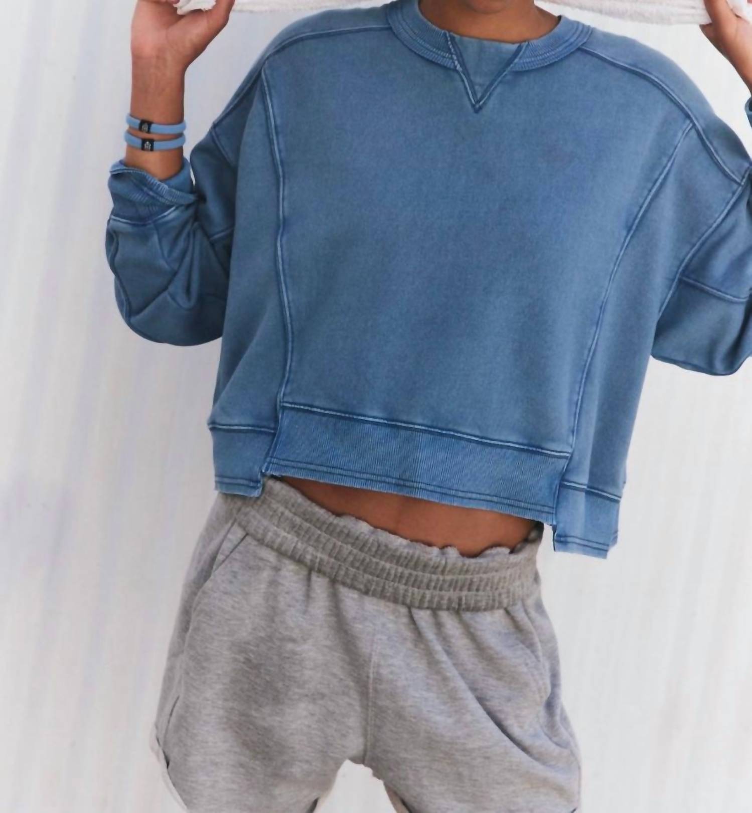 The Intercept Pullover by Free People is your go-to sweatshirt for fitness and lounging, featuring a boxy, relaxed fit and long drop shoulder sleeves. Made from a soft cotton blend, this blue pullover sports a slightly cropped length of 21.5 inches. It's designed with a classic crew neckline and features a convenient pull-on closure for easy wear. Crafted as part of the FP Movement collection, it's machine washable for easy care and import. Measurements for size small include a bust of 50 inches and a sleeve length of 19.5 inches.