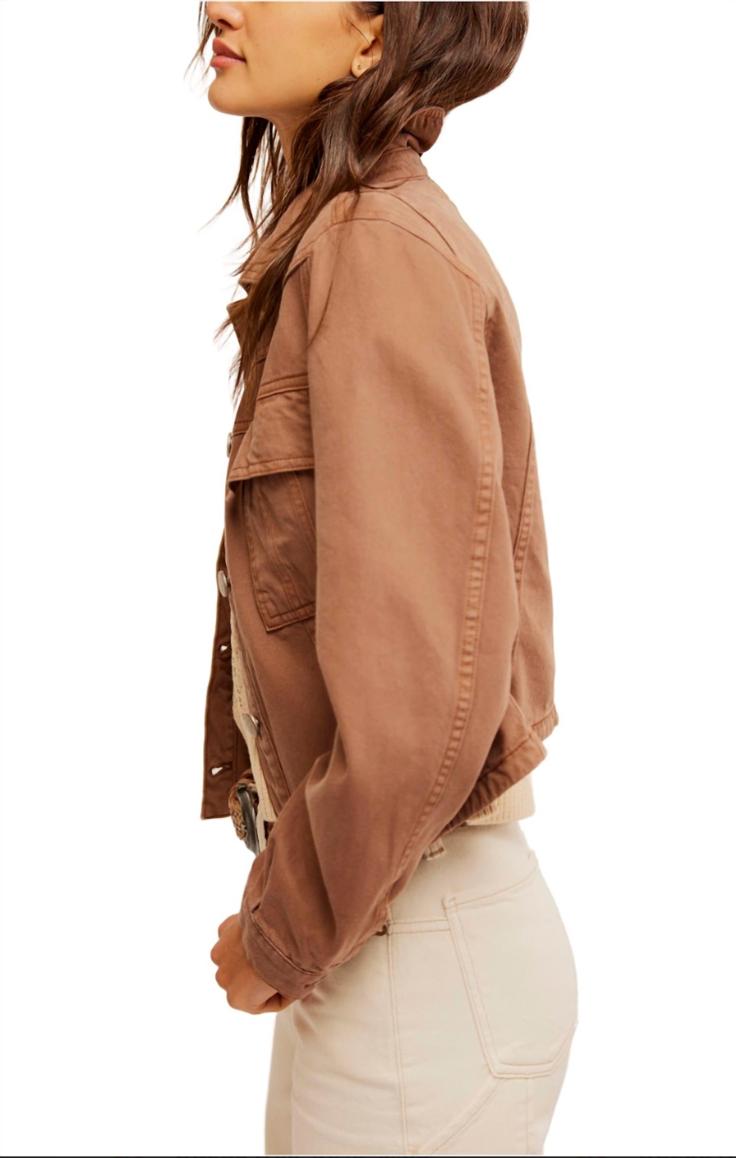 The Jade Denim Jacket by Free People offers a perfect blend of texture and timeless style in a rich Chocolate Mousse color. This long sleeve jean jacket is crafted from premium cotton, ensuring both comfort and durability. Its button closure and collared neckline enhance its classic appeal, while side pockets add a touch of practicality. Ideal for any casual outing, this jacket brings a chic edge to your ensemble.